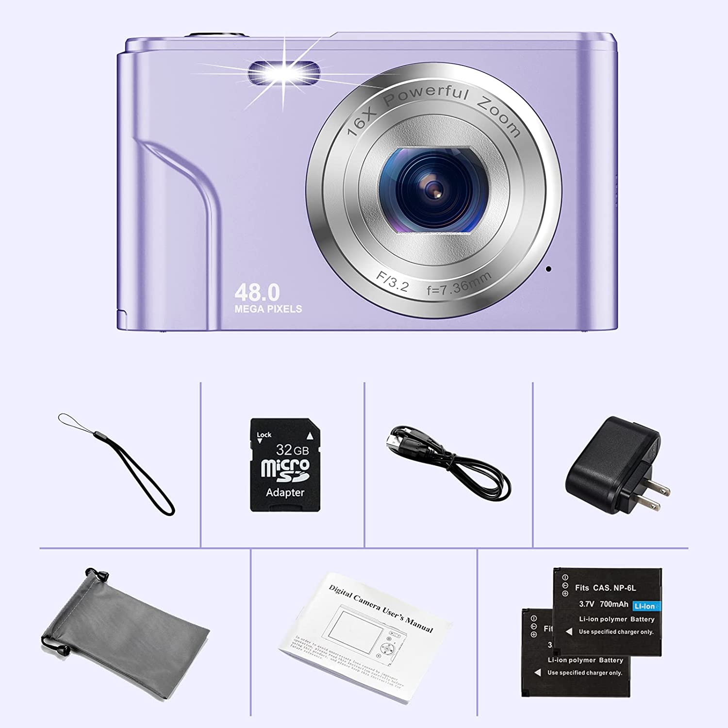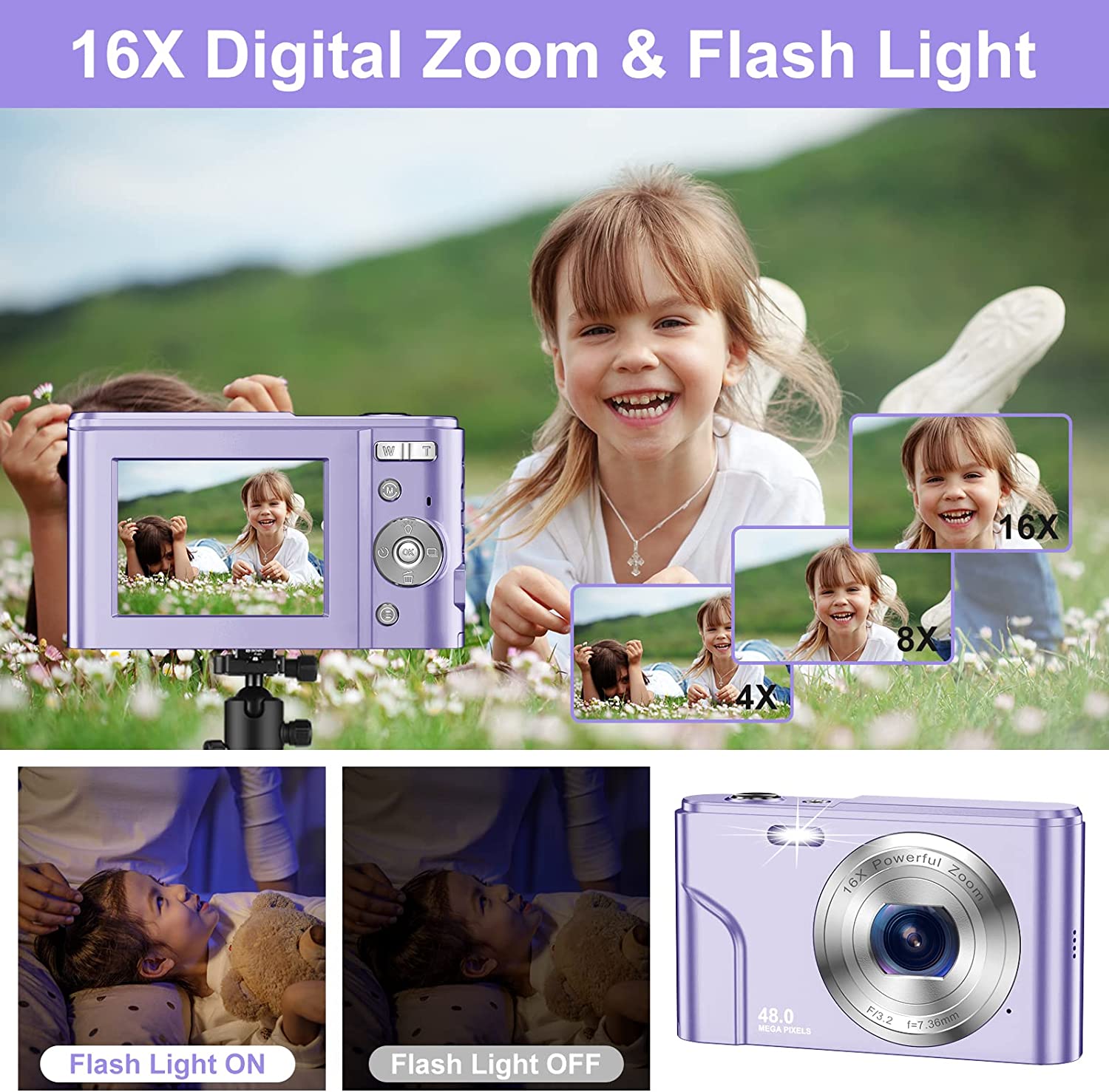 - 【Upgraded Autofocus Digital Camera】 New released autofocus digital camera for teens, when you press the shooting button halfway, it will catch the focus automatically, and after the focus frame on the screen turn green you need press shooting button fully to get vivid macro images, concentrate more on capturing the momentary scene of the subject, this small digital camera is easy to operate to meet the needs of kids teenagers students elderly.