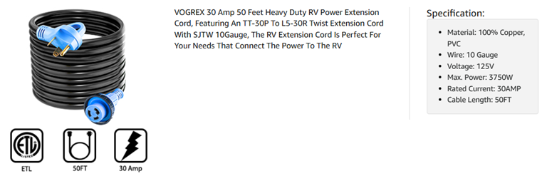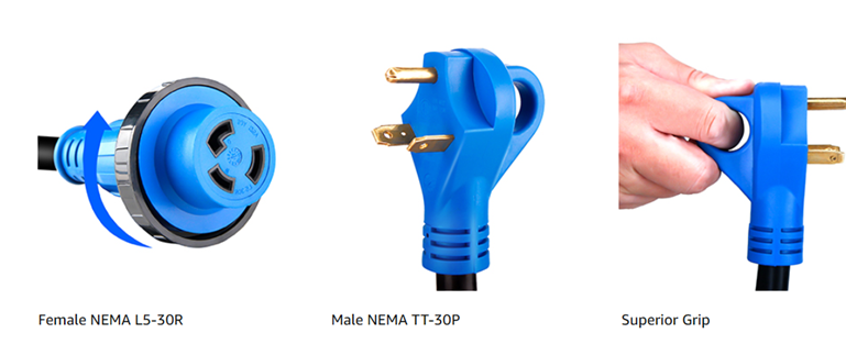 - ⚡【ELECTRICAL RATING】30A, 125V, 50 feet, STW power cord with TT-30P male plug and L5-30R female receptacle. ETL/cETL approved