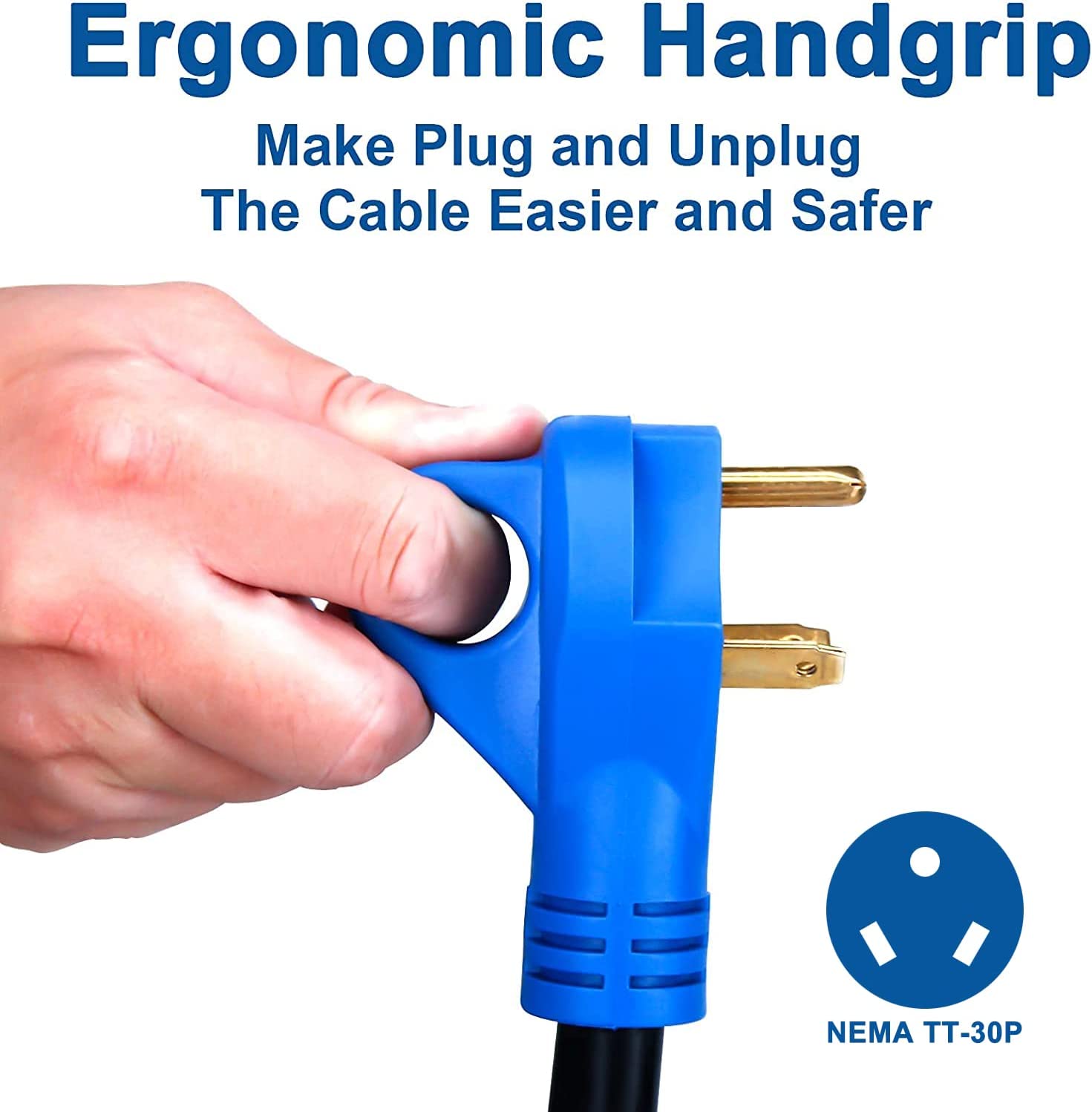 - ⚡【GRIP HANDLE】Equipped with an easy grip handle to make plugging and unplugging this cable easier and safer for you. The RV power extension cord is in black cable blue handle
