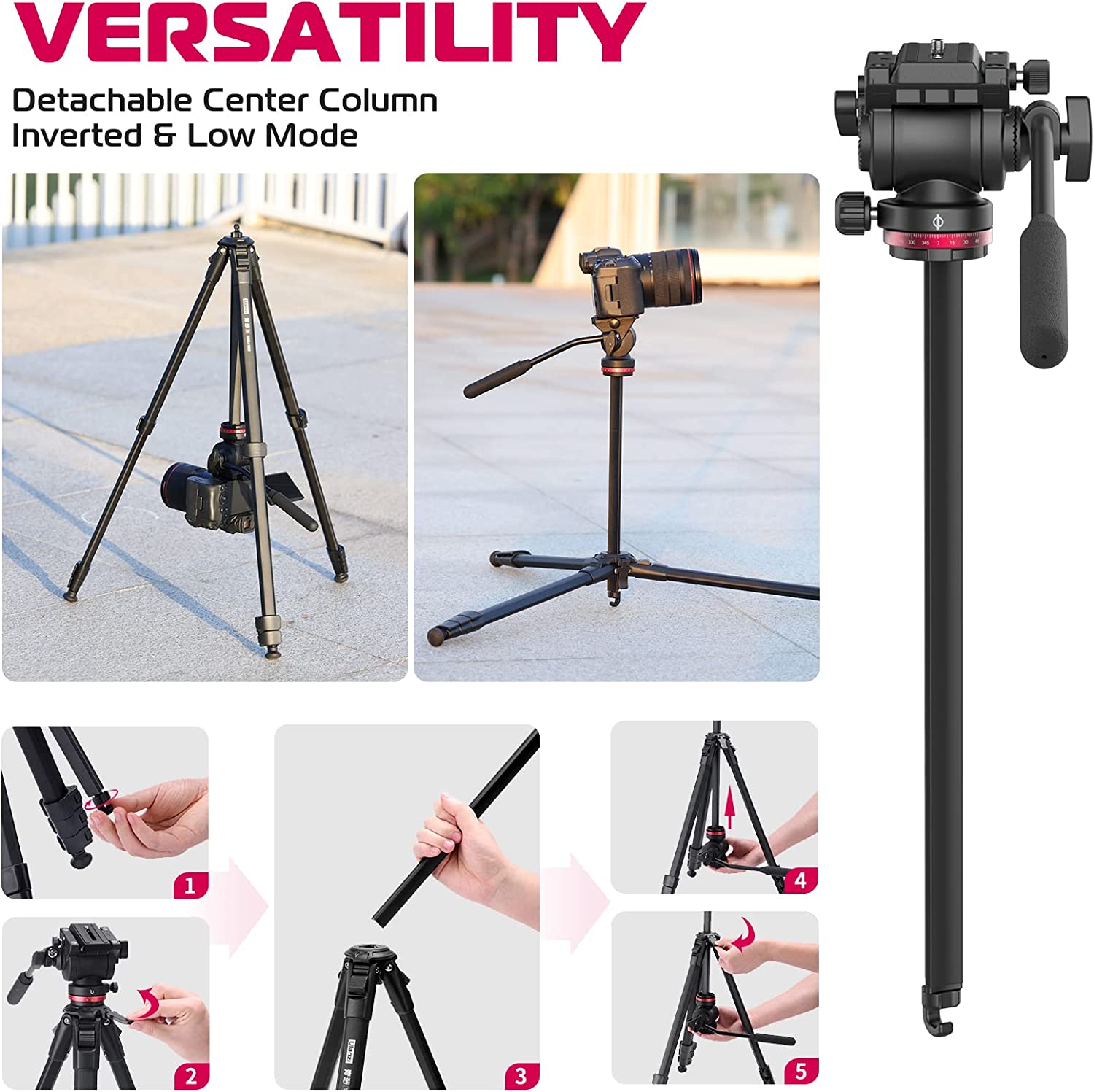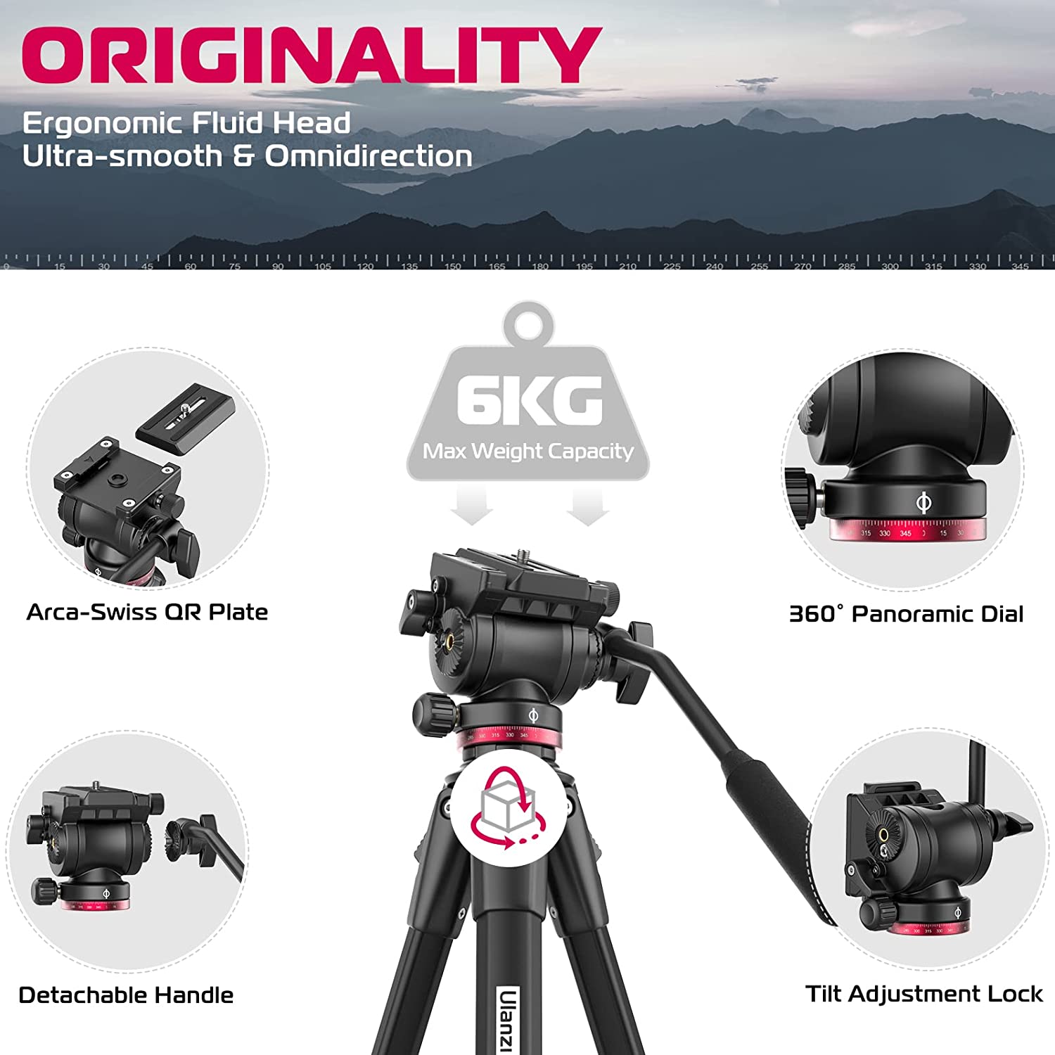 ULANZI MT-56 Ombra Video Travel Tripod, 63" Professional Camera Tripod with Fluid Pan-tilt Head, Aluminum DSLR Tripod Max Load 13.2 LB for Nikon Canon DSLR Camcorder, Phone Holder Included