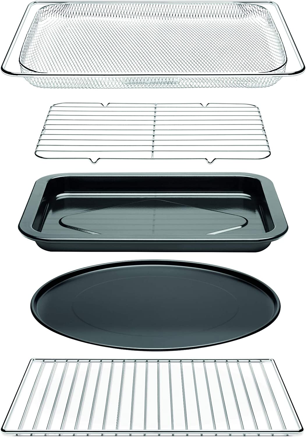 - INCLUDED ACCESSORIES: Air Fry basket; Enamel Roasting Pan; 13 inch Non-Stick Pizza Pan; Wire Rack and Broiling Rack