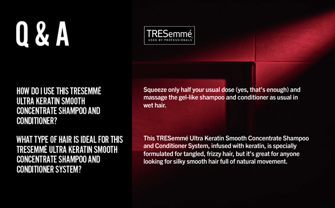 There’s something about silky hair that’s full of natural movement that lets you take on the day with confidence. You can now get that style without having to go to a salon with TRESemmé Ultra Keratin Smooth Concentrate Shampoo and Conditioner. Using only half your usual dose, this ultra-fast lather concentrated hair shampoo and conditioner formula penetrates hair strands and delivers salon smoothness and shine in just 30 seconds. The end result? Gorgeously silky hair that lasts and lasts. How to use the Ultra Keratin Smooth Concentrate System: Step 1: Squeeze ONLY HALF of your usual dose (yes, that's enough) and massage the gel-like smoothing shampoo in wet hair. Step 2: After shampooing, squeeze ONLY HALF of your usual dose (yes, that’s enough) and massage the gel-like conditioner as usual in wet hair. Step 3: Finish and style with your favorite TRESemmé products. Every choice we make at TRESemmé, from the values we promote—such as not testing on animals and being PETA-approved—to the carefully selected ingredients we use, are made to give you professional salon quality haircare products you can trust. Because 70 years on, we believe in the power of style. So tell your story, make your mark – and achieve your aspirations with confidence. With TRESemmé, you can DO IT WITH STYLE.