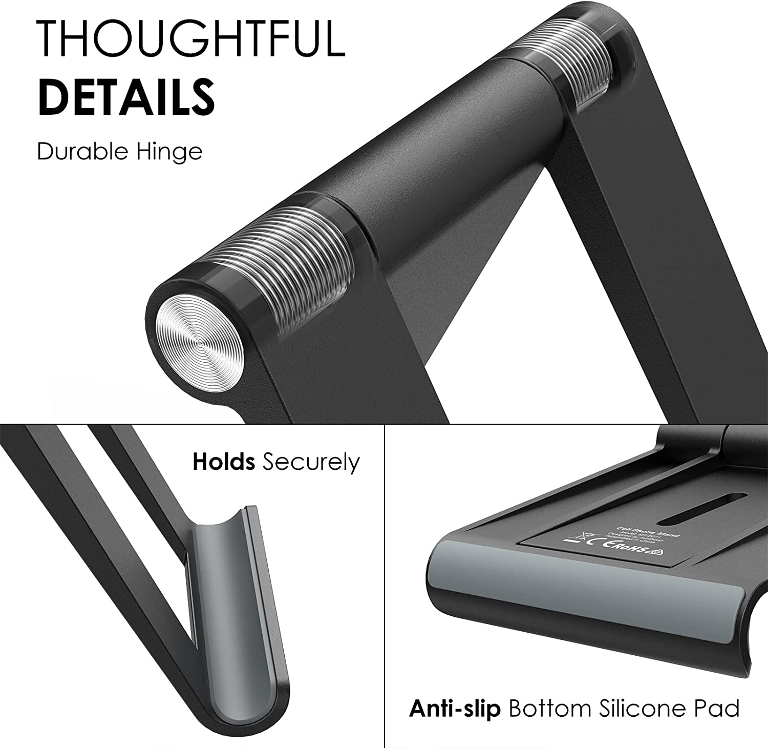 Minthouz Adjustable Cell Phone Holder for Desk - Foldable Phone Stand Compatible with iPhone 14 13 12 Pro Max Mini 11 Xr 8 Plus SE, iPad Mini, Switch, Android Smartphone, Tablets - Black