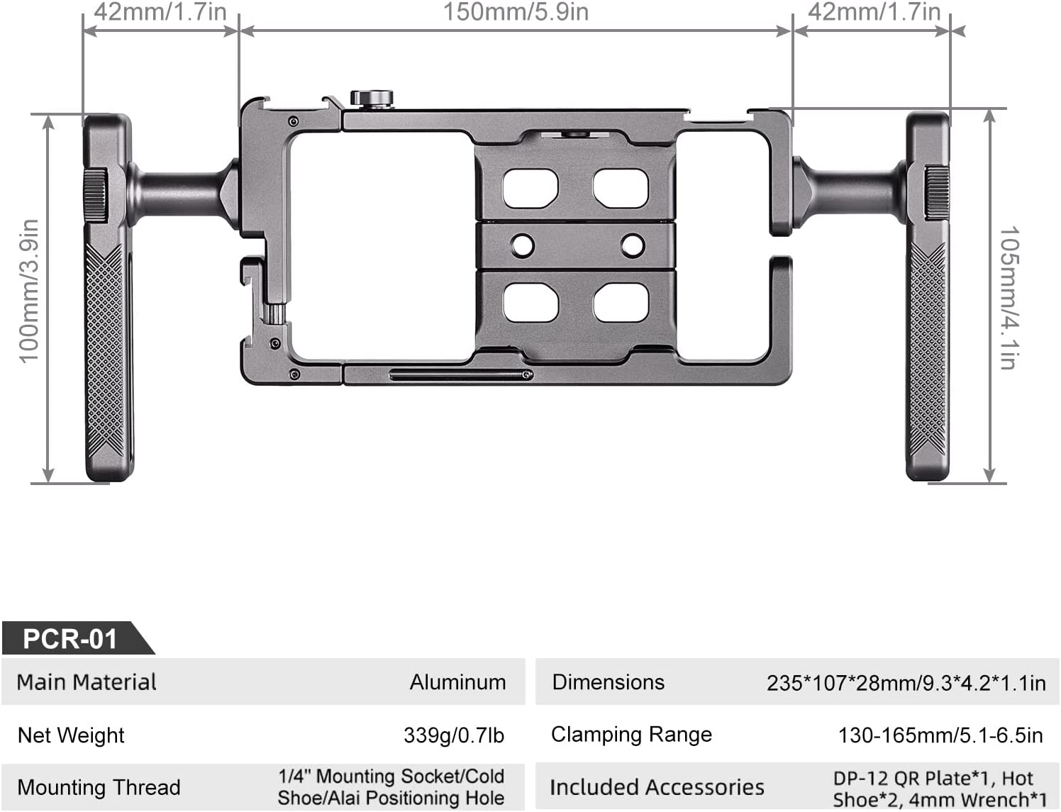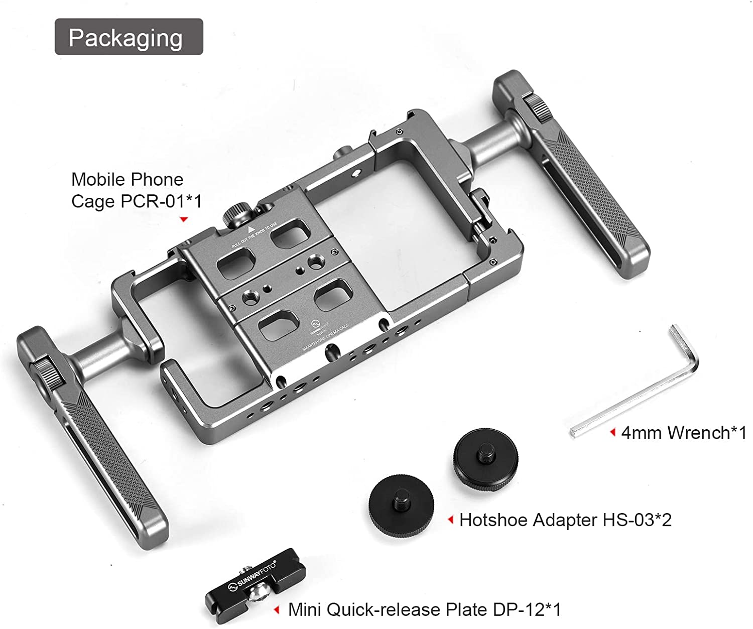Included Accessories: 1pc QR plate DP-12 to help mount your cage on an Arca standard tripod directly; 2pcs code shoe to 1/4” screw adapters to work with microphones, video lights and monitors etc. accessories.