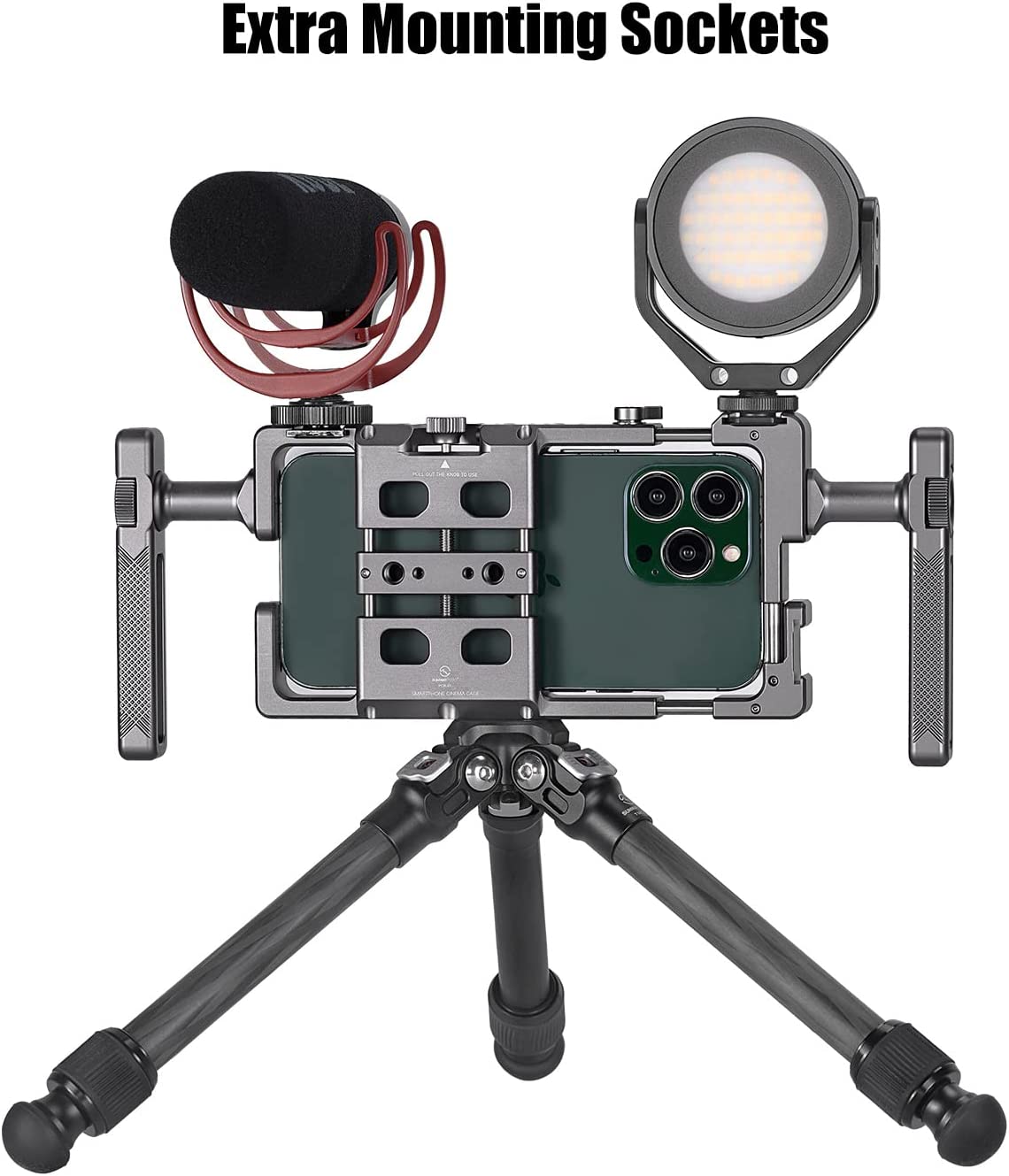Extra Mounting Sockets: there are 3 cold shoe mounts on the cage as well as 9 1/4” mounting sockets (with alai positioning hole), there are also two 1/4” mounting sockets one on each handle for mounting microphone, video light and monitor etc. accessories.