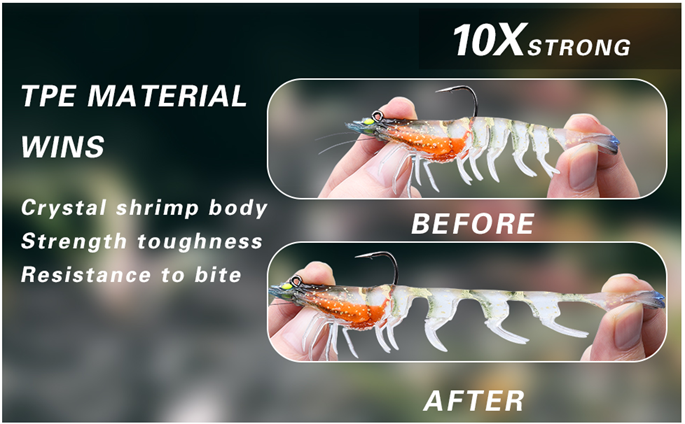 • RESISTANT TPE MATERIAL - Ready to take on multiple hits, the extreme strength and supple flexibility of TPE material will last for many, many bites and put other baits to shame. Please do not allow this TPE lures to touch other non-TPE products.
