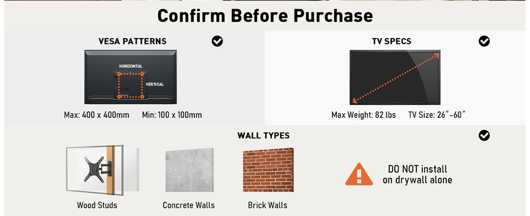 • Wide Compatibility: This swivel TV mount is an ideal choice for most 26″ to 60″ flat and curved TVs with VESA patterns 100x100 to 400x400mm. Please verify the size, weight, and VESA pattern of your TV before purchase. Compatible with wood studs, concrete, and brick wall mounting.
