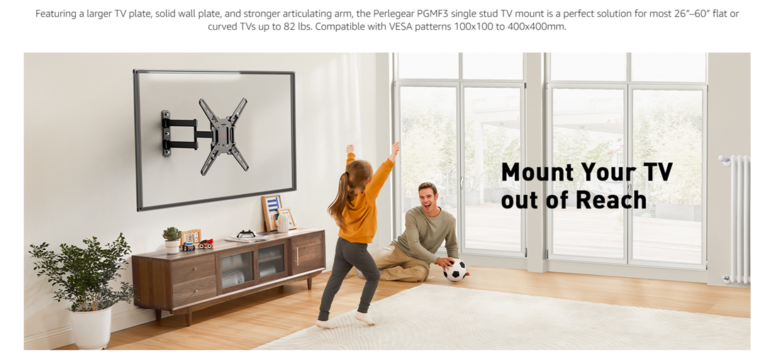 • Sturdy Construction: Featuring premium heavy-duty steel and reinforced structure, the Perlegear TV wall mount is UL certified for its performance, durability, and safety, and supports up to 82 lbs. Larger TV plate and solid wall plate provide more peace of mind compared with other mounts.