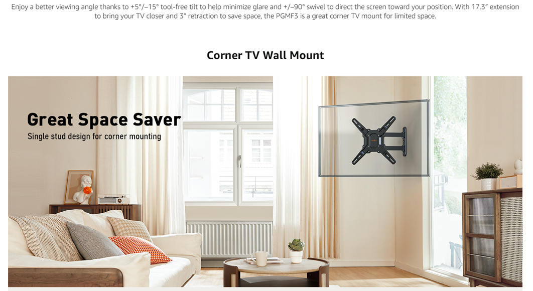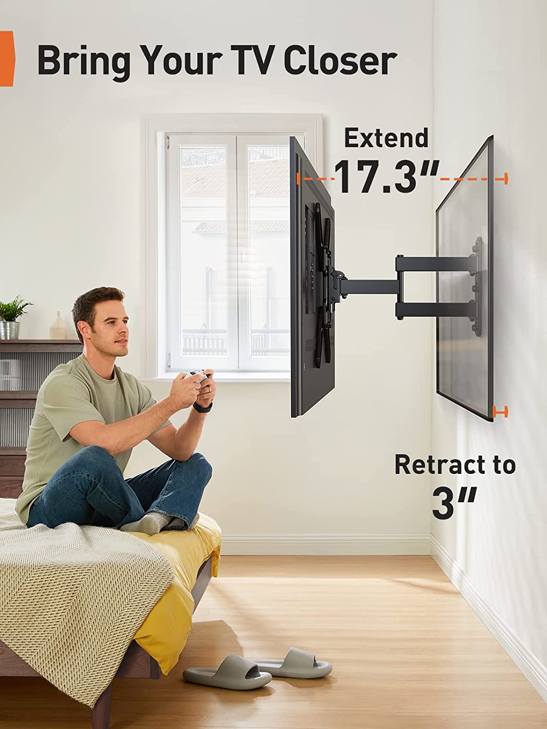 • Space-Saving Design: The Perlegear corner TV mount extends up to 17.3″ to bring your TV closer and retracts back to 3″ from the wall for a low-profile look. The single stud design fits awkward spaces like corners to maximize your living space.