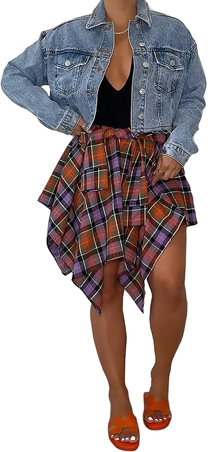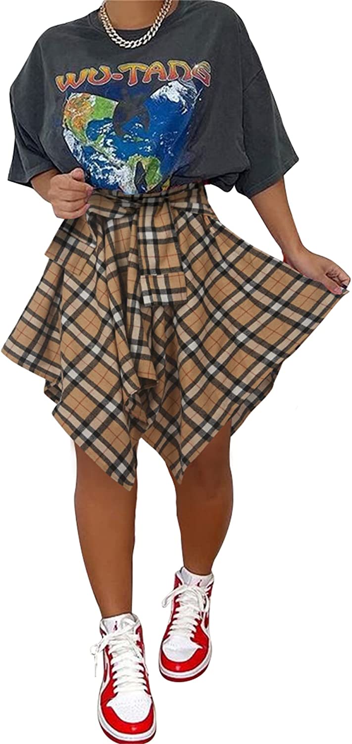 Features: 90s vibes plaid pattern, grunge pleated design, irregular hem, flared A-line shape, and elastic waist, shirt-sleeve-style ties design, just like tying plaid overshirts around our waist.