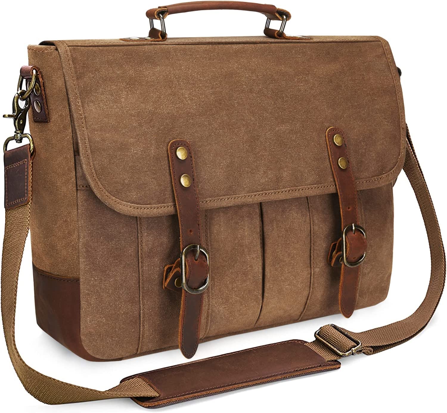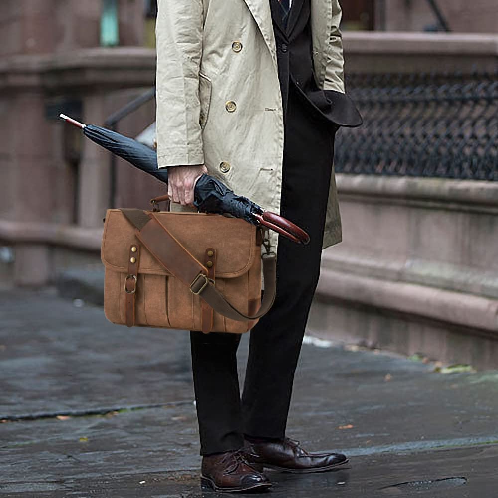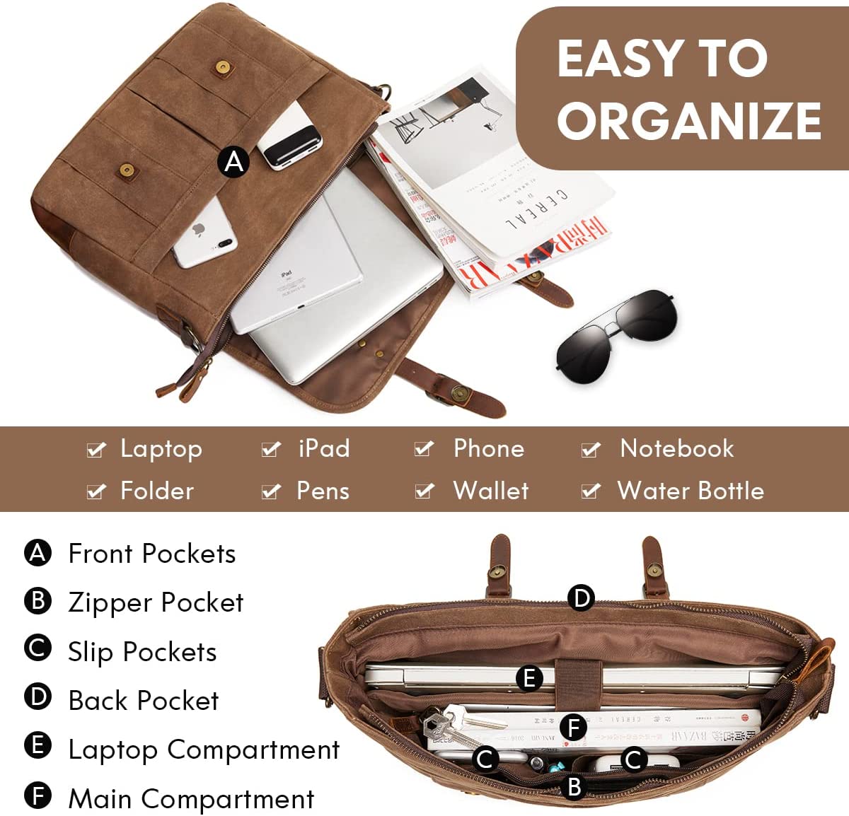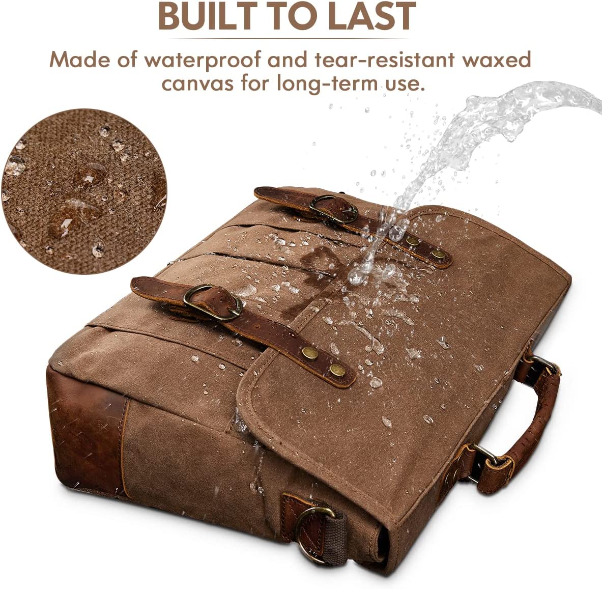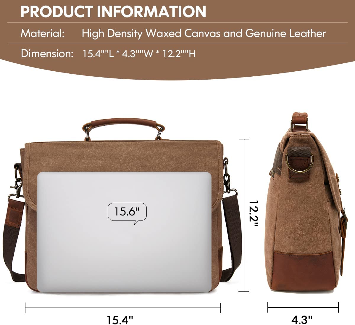 • STUDRY & WATERPROOF: The mens messenger bag is presented in high density waxed canvas and genuine leather, crafted with quality solid hardware, durable and functional. Every scrape on surface create a modernized vintage look. The briefcase's dimension is 15.4""L * 4.3""W * 12.2""H, great for college, work or travel.