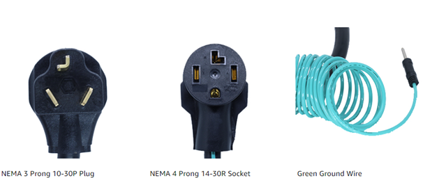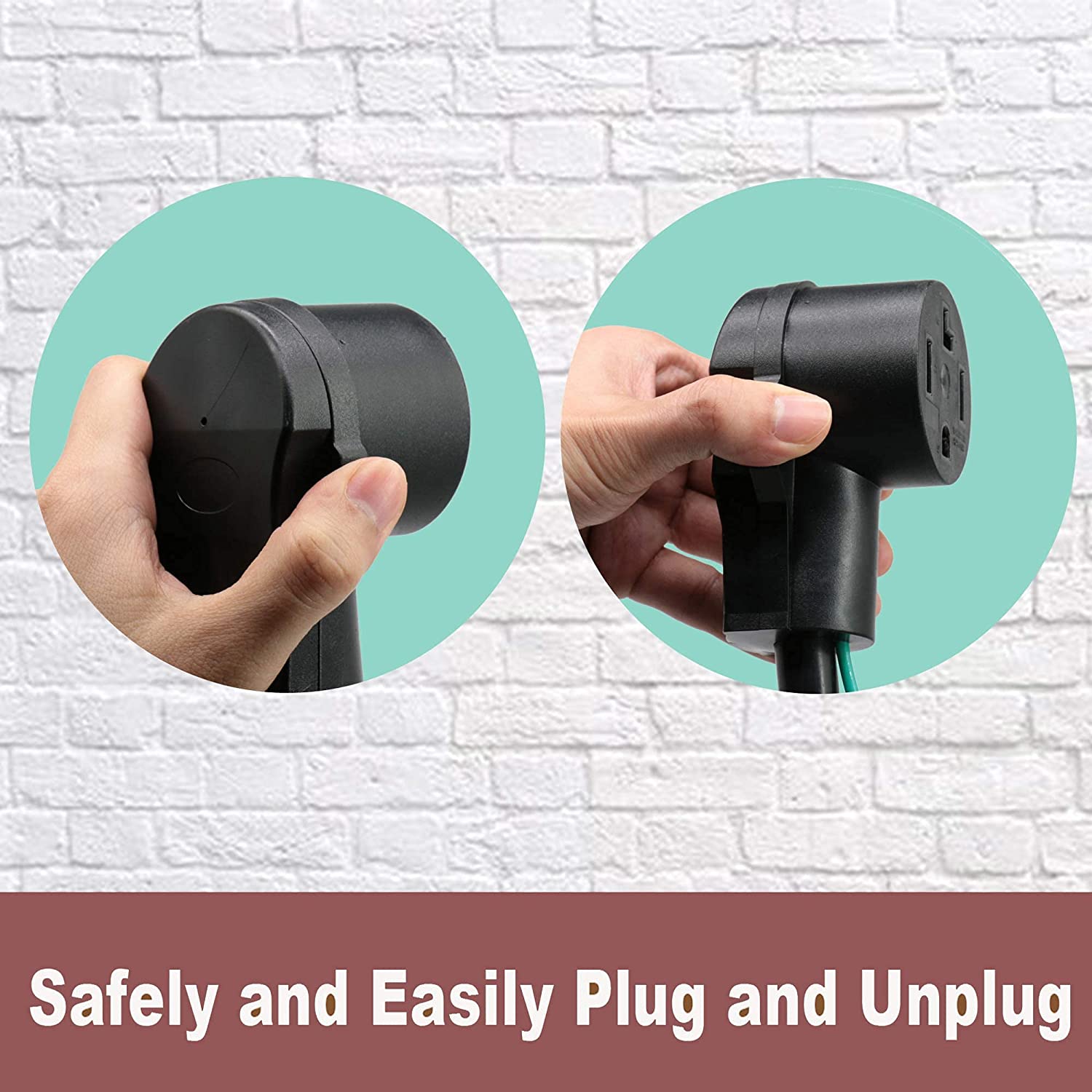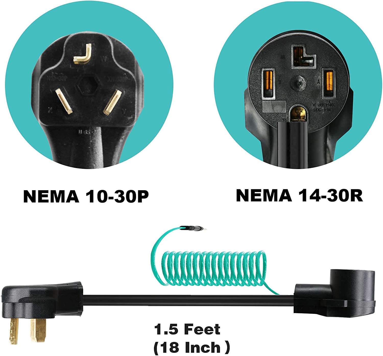 - 【ELECTRICAL RATING】 NEMA 3 prong 10-30P plug 250V 30 Amp molded male. NEMA 4 prong 14-30R socket 125V/250V 30 Amp molded connector. Both are right angle, max wattage 7500 watts, 10 AWG 1.5 FT.