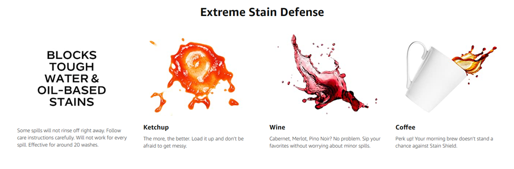 - Stain Shield technology blocks tough water- and oil-based stains before they start; just rinse with water & keep going. Stretch: Fabric stretches and moves with you for extra comfort.