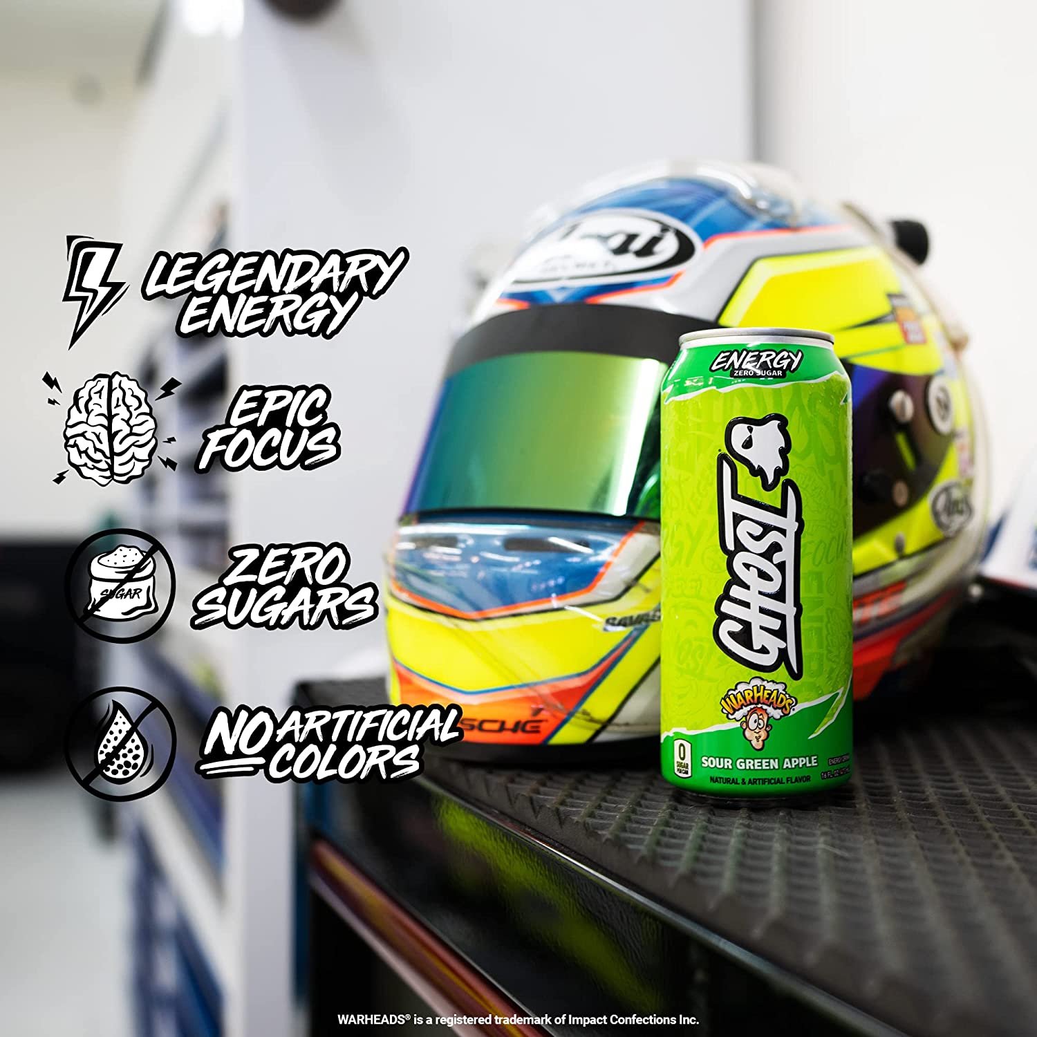 GHOST ENERGY Sugar-Free Energy Drink - 12-Pack, WARHEADS Sour Green Apple, 16oz - Energy & Focus & No Artificial Colors - 200mg of Natural Caffeine, L-Carnitine & Taurine - Soy & Glute