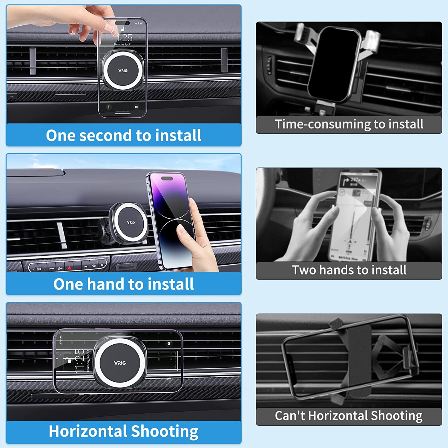 ? Easier to use: This magnetic car phone rack has no buttons, which is easier to use than the clip phone rack. The magnetic accessory just needs to place the phone close to the base of the stand, it will absorb quickly and be securely fixed on the stand. Even when driving, it can be used with only one hand.