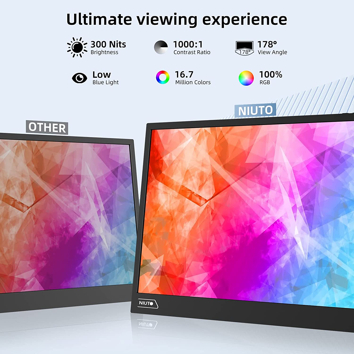 [FHD 1080P IPS screen] Niuto 17.3inch portable display, 72 sRGB IPS screen, with excellent display performance, rich colors, high color restoration, 300cd/m2, 1000:1 Contrast, 178 degrees viewing angle, better than most of the portable monitors,travel and outdoor use, convenient for office and entertainment
