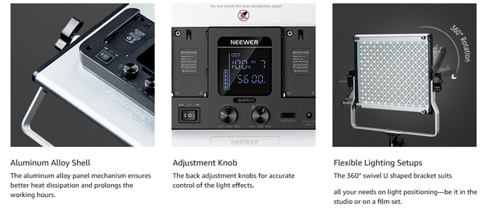 • 【Upgraded Precise Dimmable Versatile RGB Light】With upgraded cooling and light control system (constant 50W lighting, no flicker or color shift), the 660 PRO II RGB breaks the minimum brightness limit from 1% slight bright (brightness and power can reach a true 1%) to 100% ultra bright, as well as 3200K-5600K color temperature and 360° full RGB range, all ensuring smooth and precise adjustment. Power and brightness remain consistent when adjusting hue/color temperature
