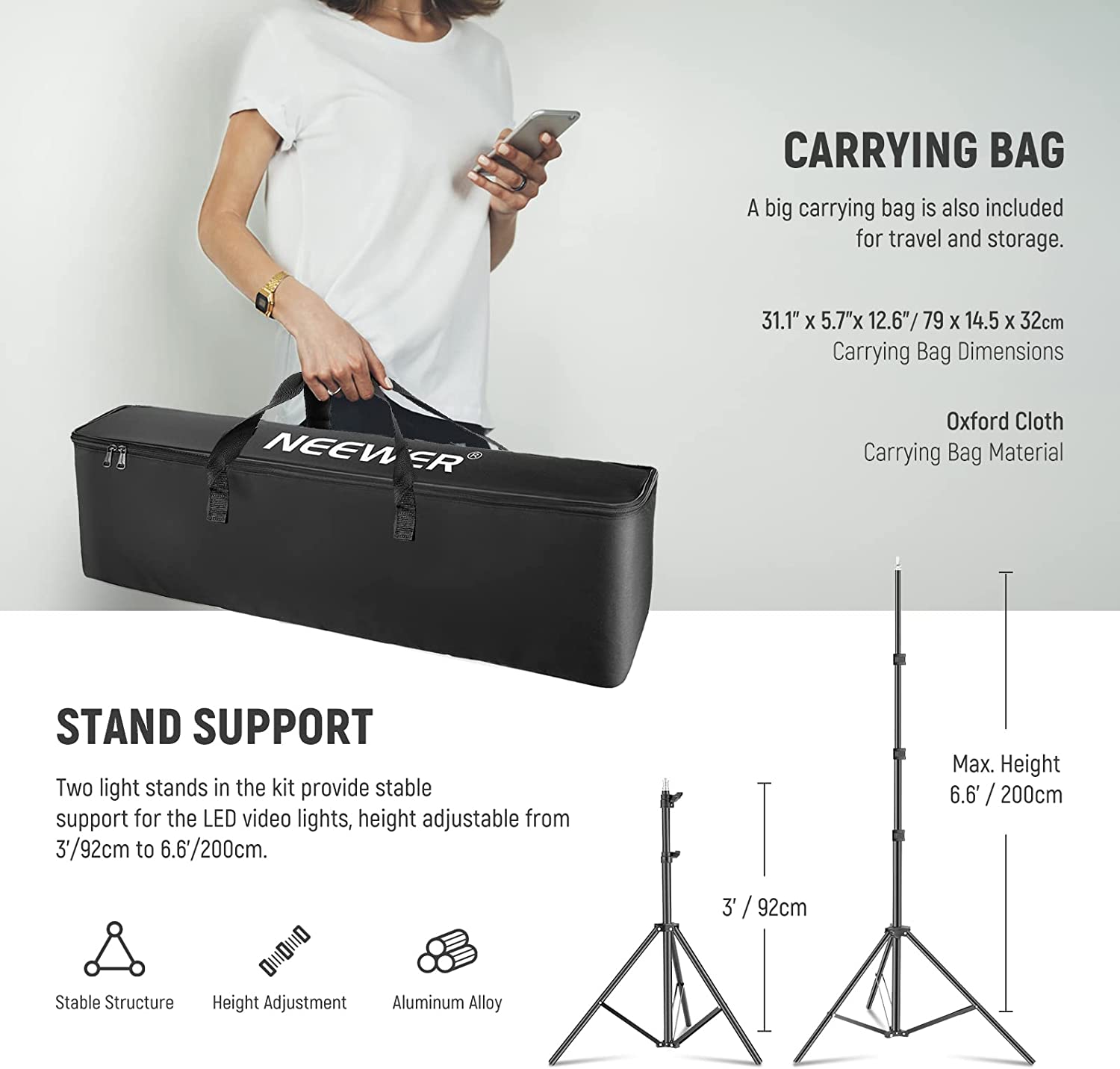 • 【Dual Power Options & Great Heat Dissipation】 The aluminum alloy panel mechanism ensures better heat dissipation and prolongs the working hours. The lights can be powered in two ways: AC adapter (included) when shooting indoors, or NP-F550 NP-F970 li ion battery power supply (battery not included) for on the go photography. A carrying bag is also included to carry and store all items in the kit