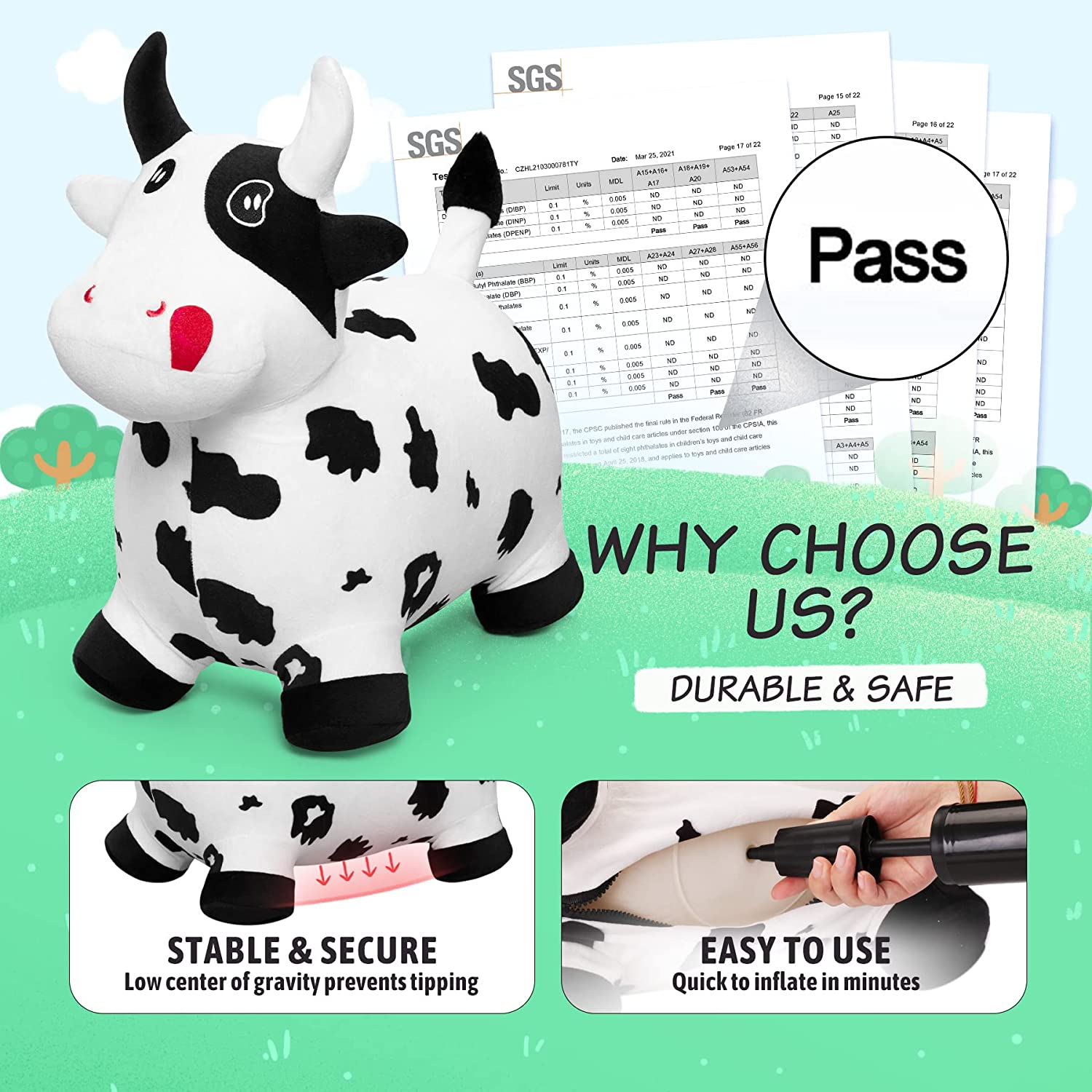 • ECO-FRIENDLY AND SAFE: Our bouncy cow are Phthalates, lead, BPA, and heavy metal-free, making them safe for your child to use. They have been tested for compliance with the ASTM F963-11 Toy Safety Standards, so you can trust that your child is safe while using our animal hopper.