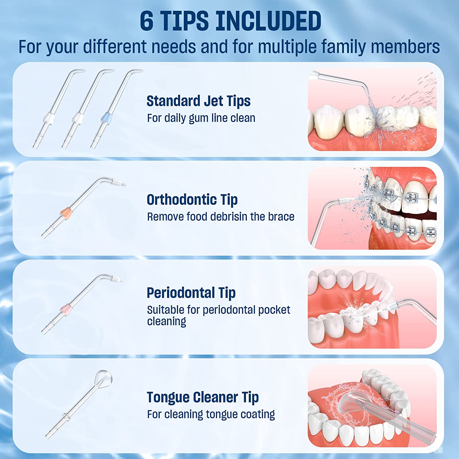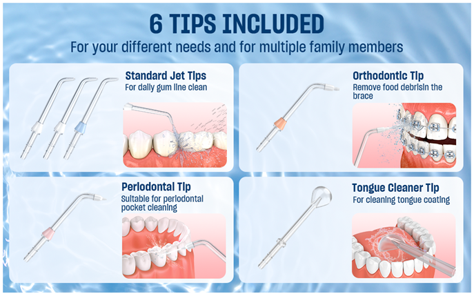 - 360°ROTATABLE & 6 JET TIPS: Our water dental pick features a 360 rotatable nozzle that allows you to easily and effectively floss at any angle, cleaning all hard-to-reach areas from trapped food debris; helps with bleeding gums and bad breath. This water teeth cleaner is equipped with 6 jet tips to help you meet all your family’s different teeth cleaning needs.