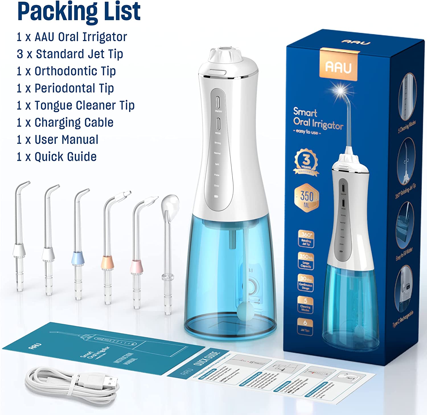 - WHAT YOU GET: 1 x AAU Oral Irrigator, 3 x Standard Jet Tip, 1 x Orthodontic Tip,1 x Periodontal Tip, 1xTongue Cleaner Tip, 1 x Charging Cable, 1xUser Manual, 1xQuick Guide.We provide 24hr Professional Customer Service. If you have any questions, please feel free to contact us.