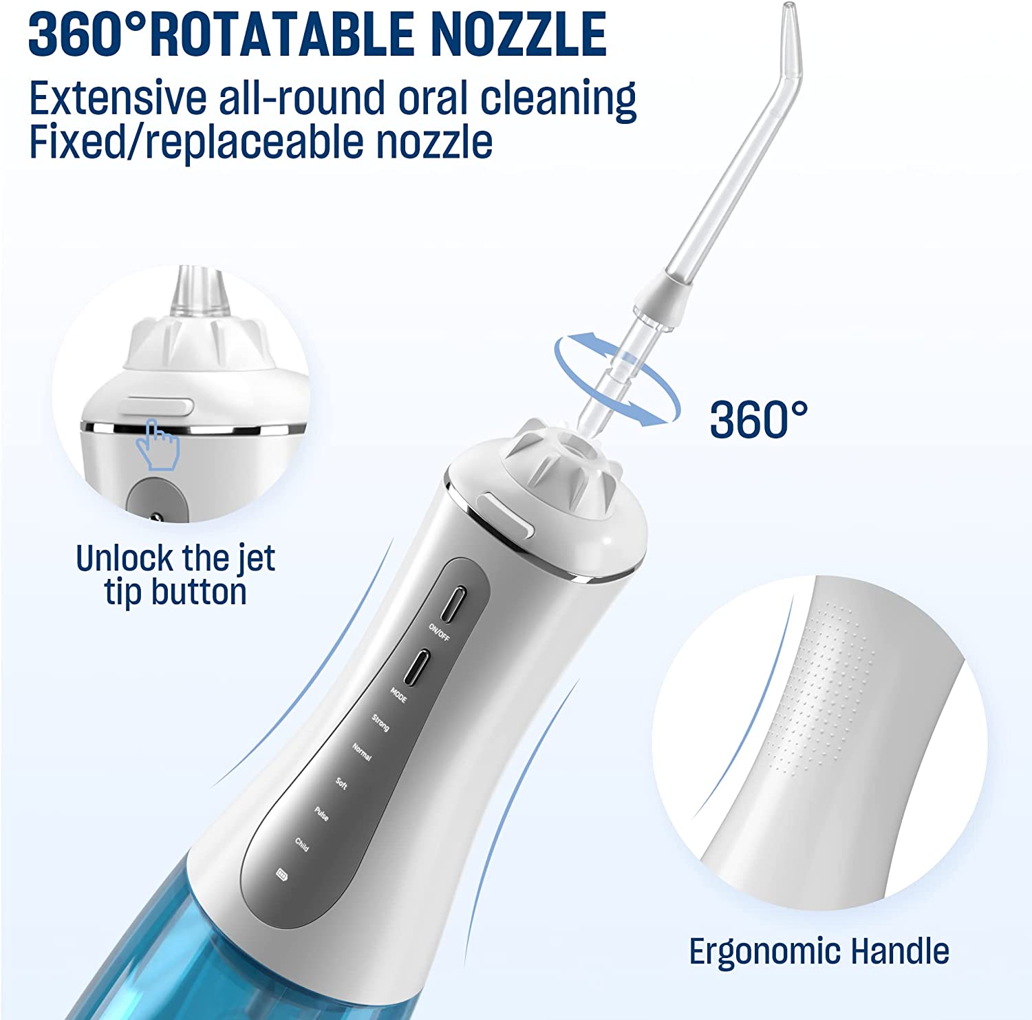 - 5 CLEANING MODES WITH MEMORY FUNCTION: The flosser features strong/normal/soft/pulse/child cleaning modes and a low noise design to meet a variety of cleaning needs. The innovative memory function keeps your preferable mode to allow you to continue using it the next time you use the portable water dental flosser even if you had turned it off.