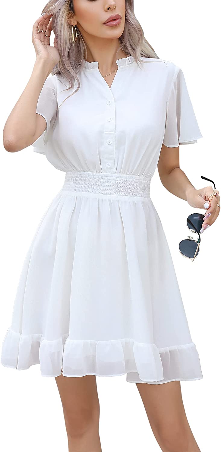 ?Feature: The casual mini dress is designed with gathered neckline and button. Plus, the sheer puff sleeve and the sheer back design adds a bit of charm and sexy to the dress. The dress cinches at the waist with its smocked waistband to accentuate your curve.