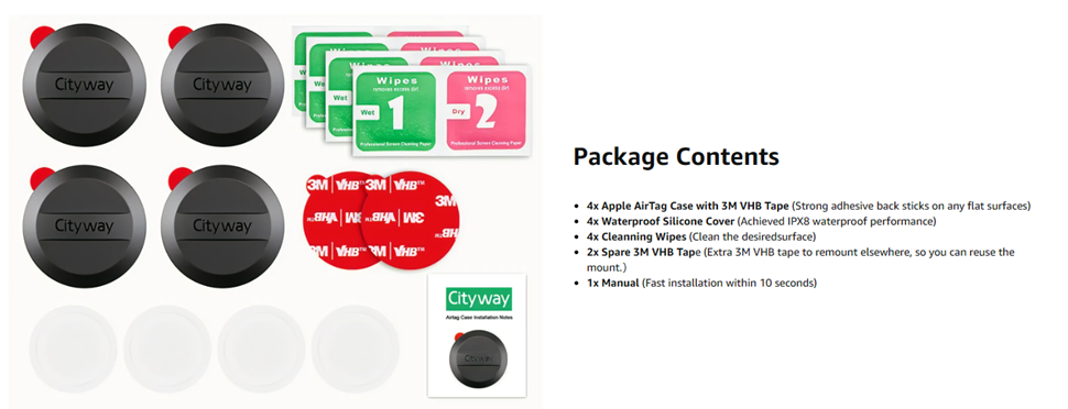 • 【Package Contents】4 Unit of AirTag Case with 3M VHB Tape/ Waterproof Silicone Cover/ Cleanning Wipes and 2 pcs spare 3M VHB Tape, a manual (Not include Airtag). Each case measure about 1.57 x 1.57 x 0.47 inches and weigh 8.2 grams. 1 Year Warranty, we take care of all quality-related issues with a REPLACEMENT or REFUND. If you have any problem, please don't hesitate to contact us and we will solve it for you within 8 hours.