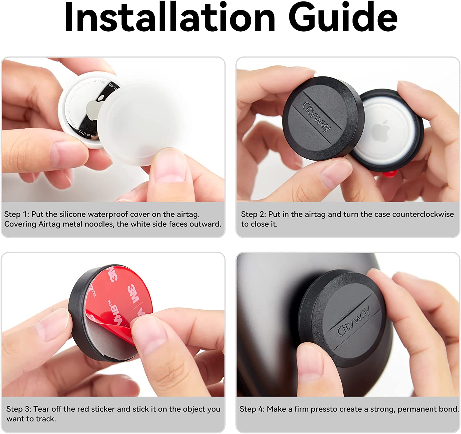 • 【Easy to Attach】Installs in seconds with premium 3M VHB adhesive. You just need put your Airtag in the case, gently tear off the red liner on the back, and stick it on the surface of anything you want to track (*Avoid super curvy spots for a long-lasting stick, at least 75% of the area is covered.) NOTE: when you install, you need to clean the surface of the object first, do not get contaminated with dust and liquid, otherwise it will affect the adhesion (cleaning wipes included).
