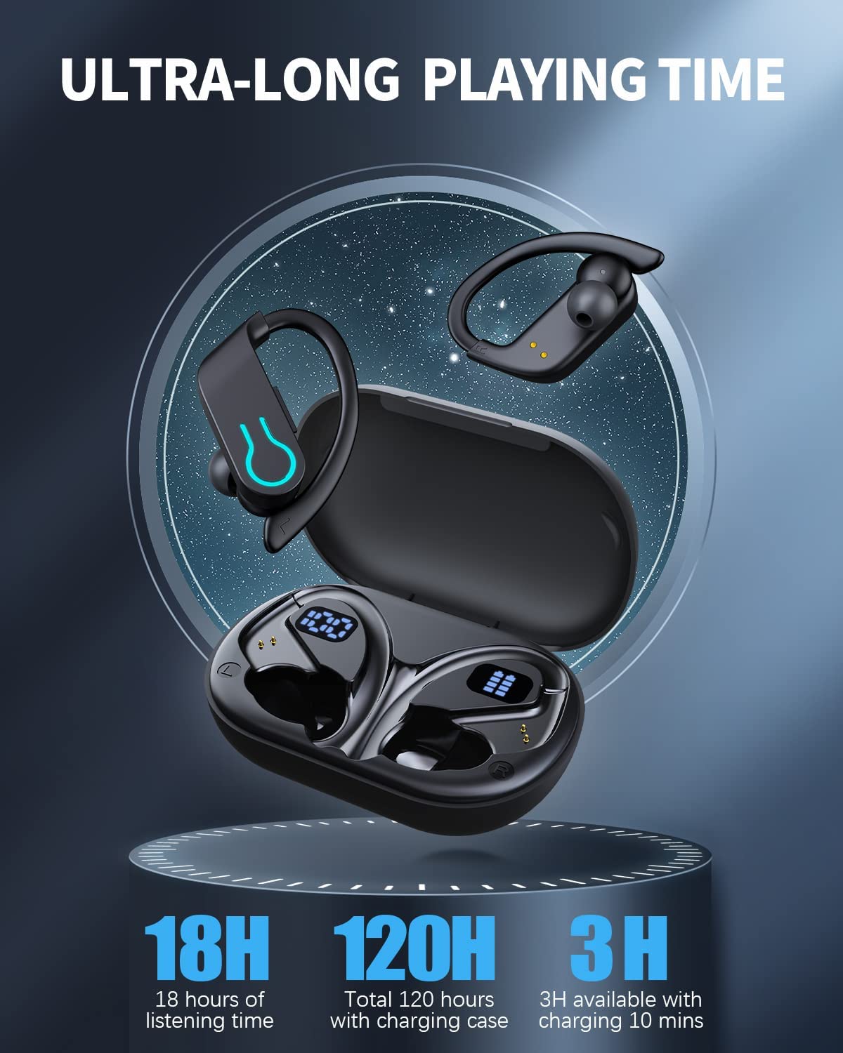 - ?【120H Playback and LED Digital Display】Single wireless earbuds can be use 18Hrs, up to 120Hrs of listening time with 9 additional charges from 950mAh battery capacity charging case. Charging case with a clear digital display, as well as the left and right sides with the earbuds power display, each grid represents 25% of the power. During charging and connected, the LED light will flash.