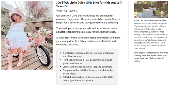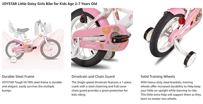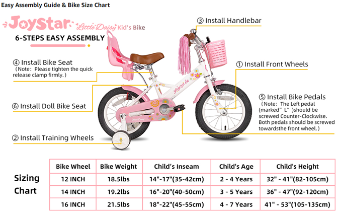 - 1. Amazing Design and Color! JOYSTAR Little Daisy Princess Girls bike with Bright colors, stylish and charming. DIY decals, beautiful basket and doll bike seat add extra fun to the ride. They have adjustable saddle & stem height for a better fit for easy pedalling. Complete with a bell that lets everyone know she's on the move.