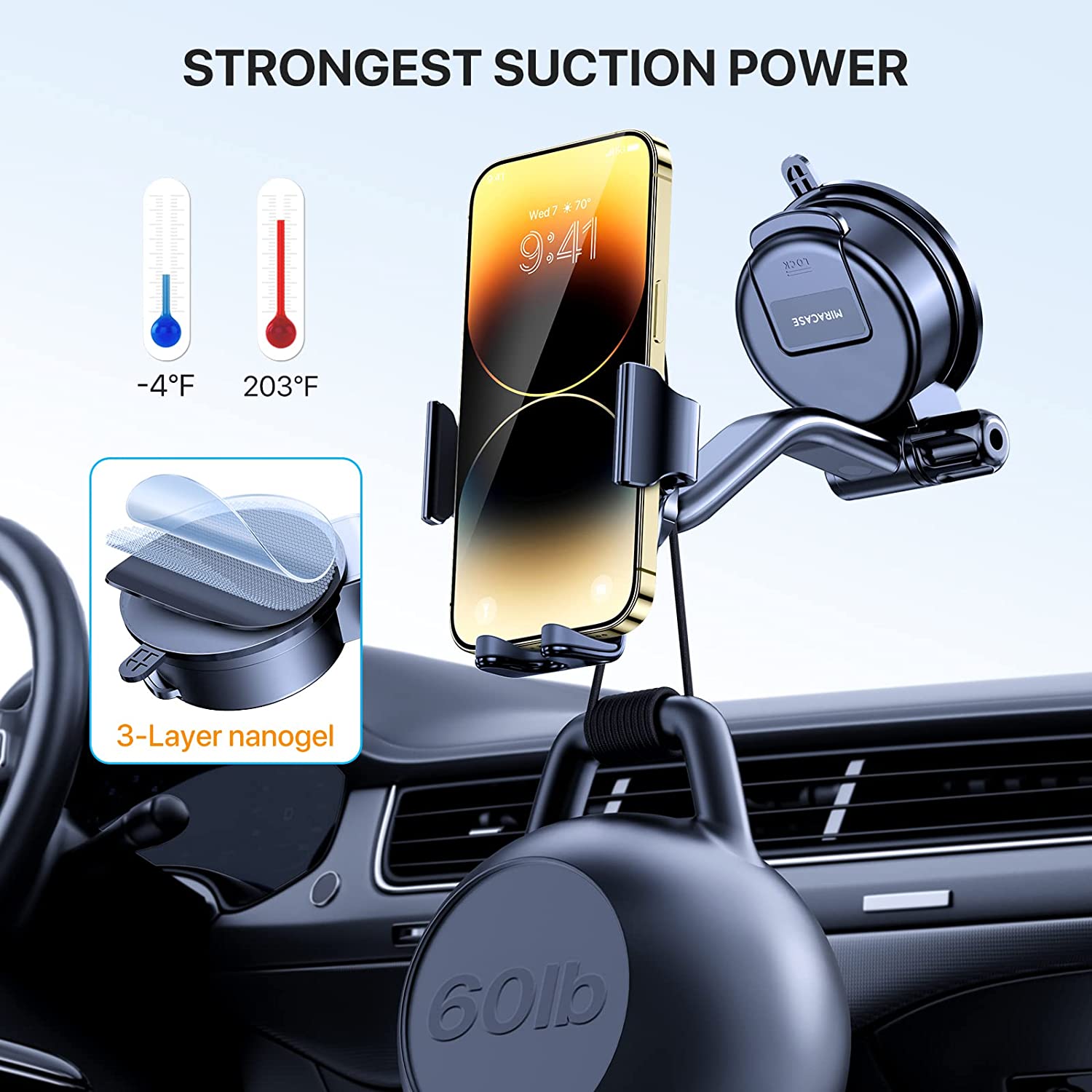 ?[STRONG SUCTION CUP & SUPER STABLE] Miracase car cell phone holder uses third-generation suction cup, upgraded 3 layers nano-gel, can bears weight up to 60 lbs force! Powerful suction keep your cell phone stay stably even when drive on a bumpy road. The suction cup can withstand the temperature from -20℃/(-4°F) to 95℃/(203°F), works well for Heatwave in California perfectly. (Note: The suction cup are reusable; If the surface of suction cup are dirty, wash it and let it air dry.)