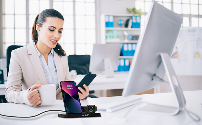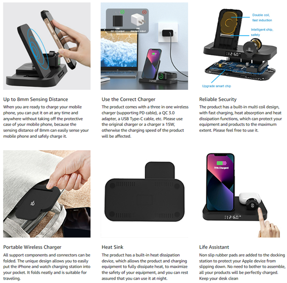 - 3-in-1 fast wireless charger: an integrated charging station for multiple devices. The charging station is compatible with Apple Watch+AirPods+iPhone. The 3-in-1 charging station can be one Apple watch charging station, one mobile phone charging station and one AirPods charging station, and is compatible with 99% of mobile phones that support wireless charging.