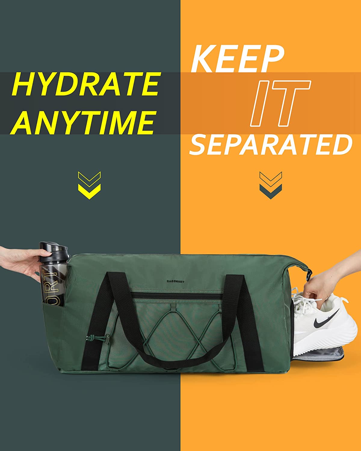OUT-OF-SIGHT STORAGE: Sizes 22(L) x 7.1(W) x 11(H) inch. The BAGSMART Workout Bag is ideal for everyday use before and after training. The wide bottoms give you plenty of space for your things. The waterproof fabric inner pocket separates dirty and wet clothes(or toiletries) from other items for wet and dry storage.