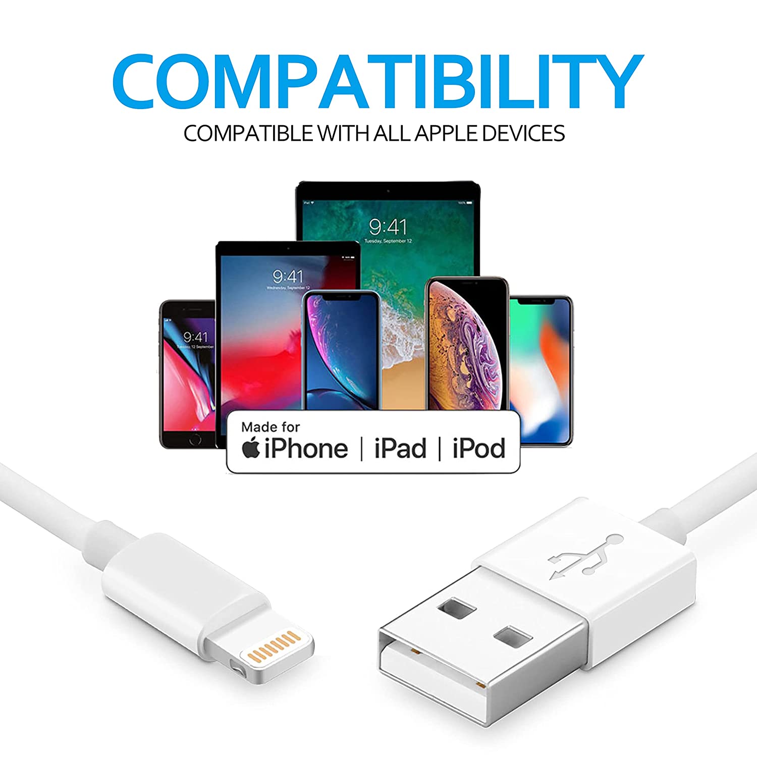 - 100% Perfect Compatibility:Our iPhone USB lightning cables works seamlessly with any new iPhone iPad, including iPhone 14 iPhone 13 iPhone 12 iphone 11 Pro Max SE X XS XR 8 8Plus 7 7Plus 6S Plus 6 5S 5C 5, iPad air mini pro, iPod, Airpods and more. Compact lightning connector head design ensure that the iPhone charger cable fit most phone cases and accessories.