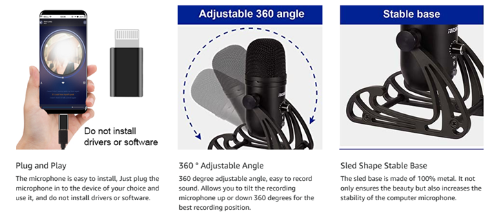 • 【Plug and Play】 You don't need to install any driver software or devices, just plug the USB microphone into the USB jack of your computer, and then plug the 3.5mm headphone into the usb microphone headphone jack. You can hear your own voice clearly.