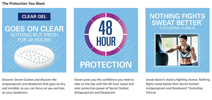 Sweat is the last thing you need to be worried about. Take one worry off of your plate first thing in the morning. With a couple quick swipes, you'll have confidence all day. Secret Outlast fights sweat better* so you get all strength and no sweat for 48 hours. Clear Gel goes on clear for no white marks. When you use Secret, you're getting the peace of mind that your deodorant will work as hard as you do. *Vs. Leading invisible solid
