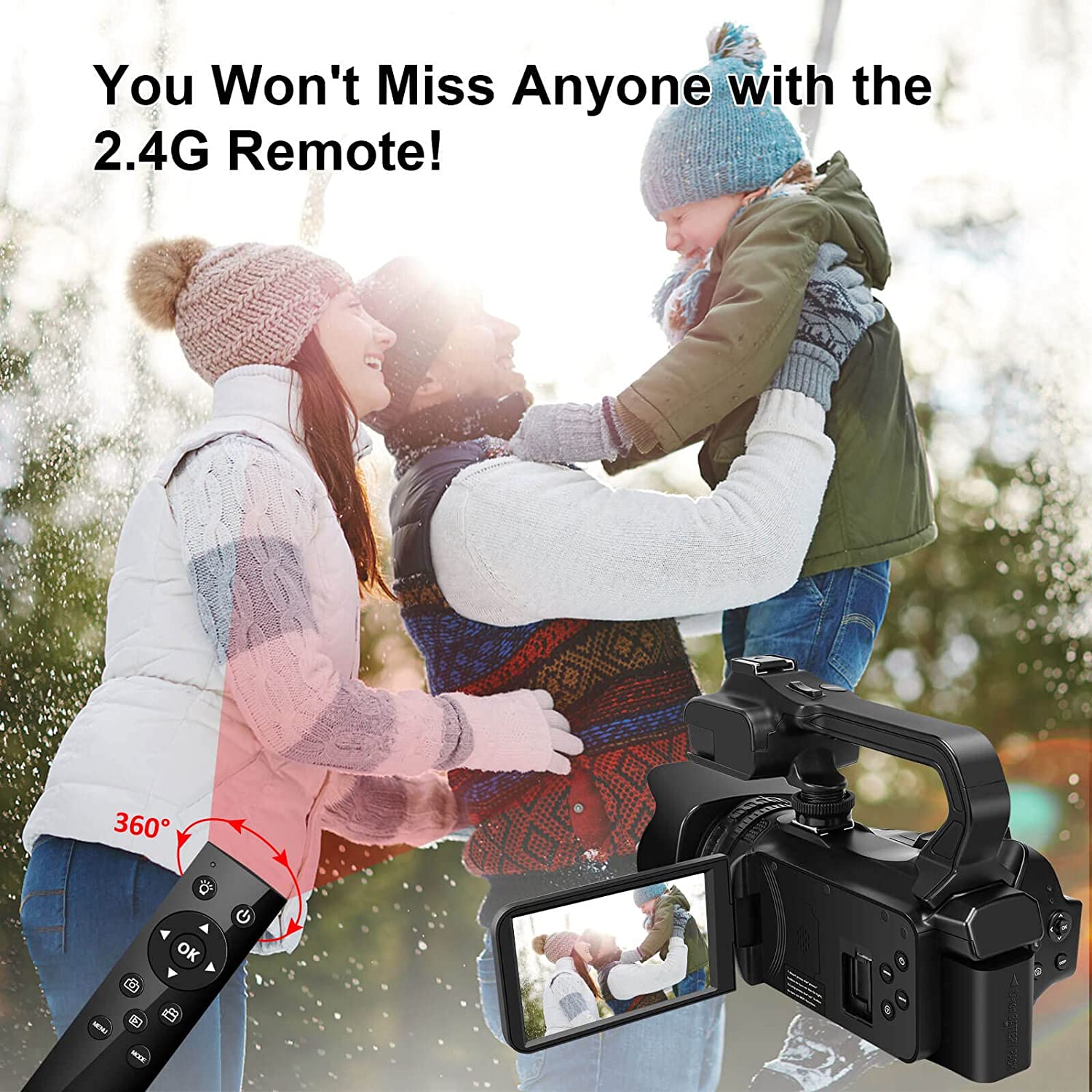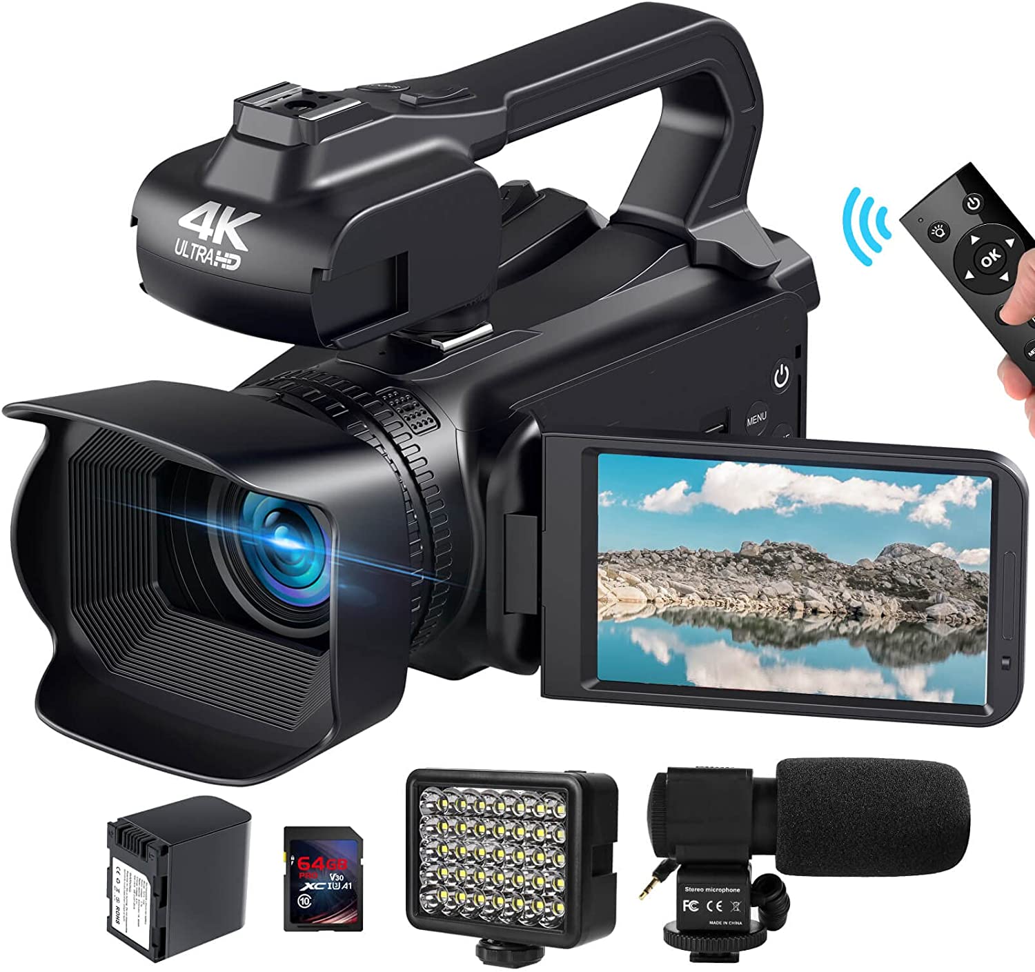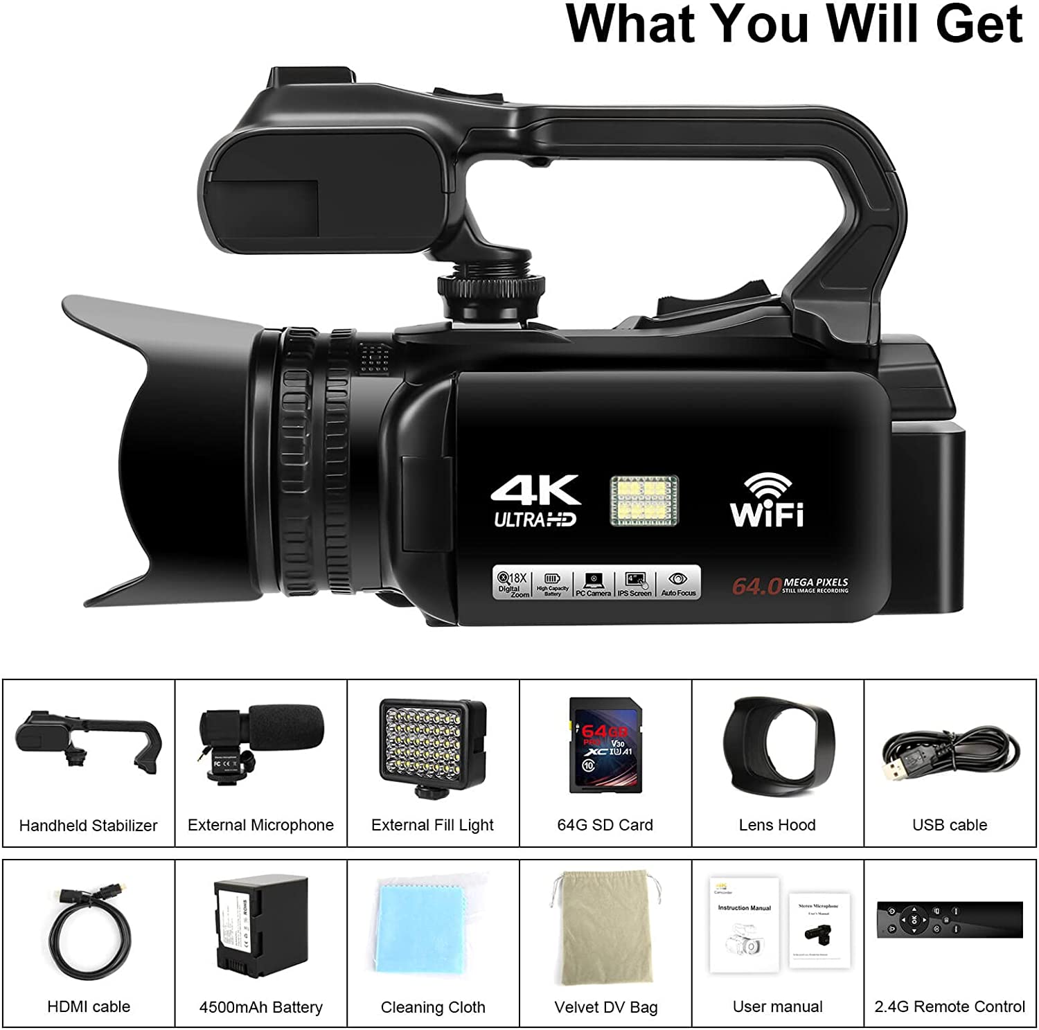4K Camcorder,64GB SD card, external microphone, camera lens hood, external fill light, 2.4G 360-degree remote control, a 4500mAh battery, stabilizers