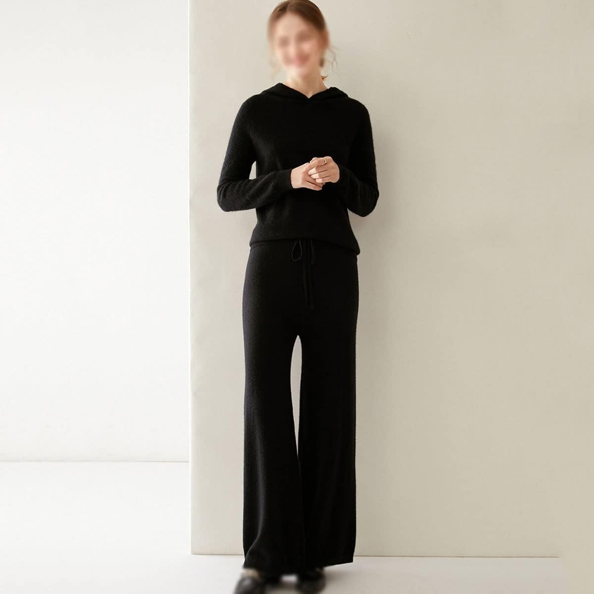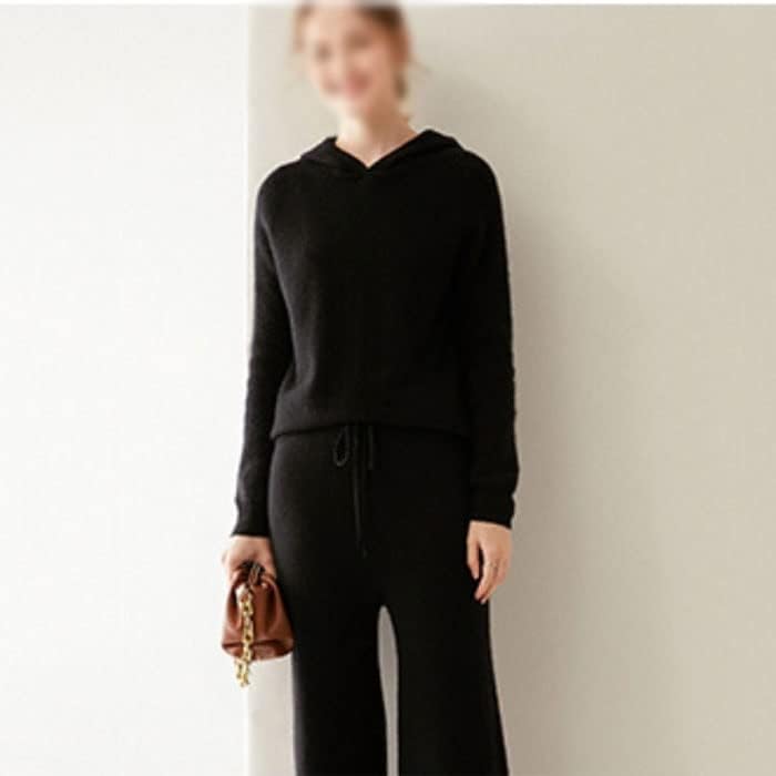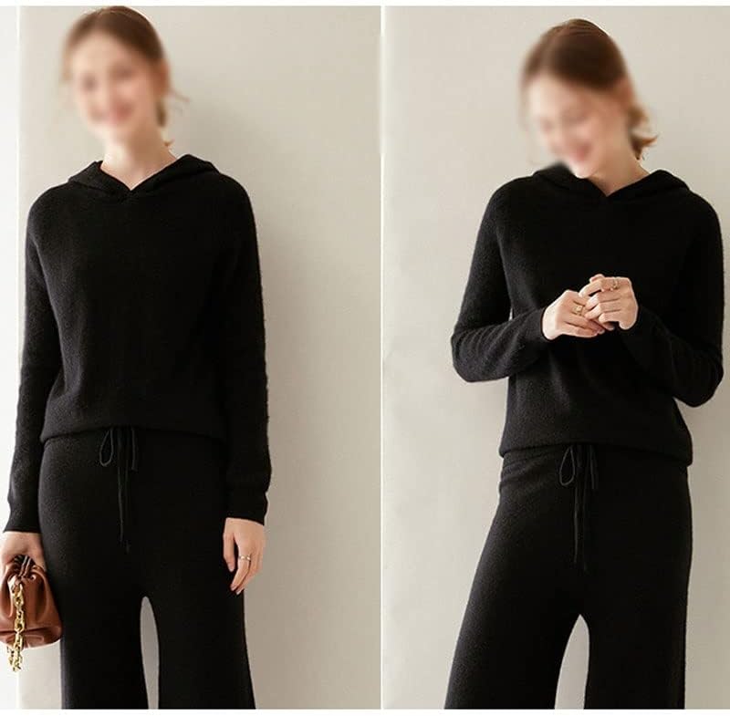 Walnut Two Pieces Cashmere Wool Suits Female Hooded Knit Sweater Set Warm Cashmere Knit Tops and Wide Leg Pant Sets (Color : D, Size : L Code)