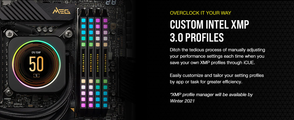 • Custom Intel XMP 3.0 Profiles: Customize and save your own XMP profiles via iCUE to tailor performance by app or task for greater efficiency.