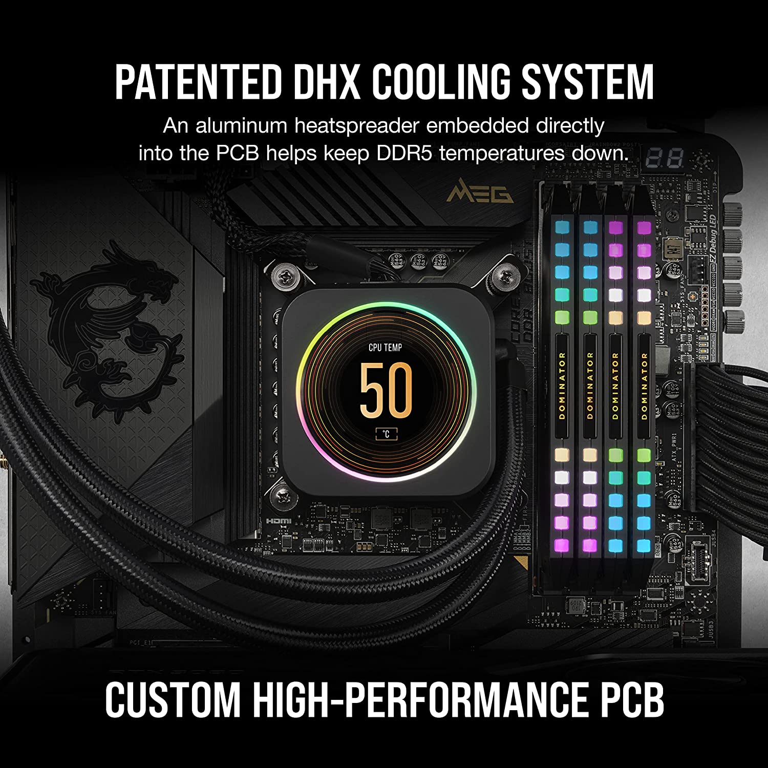 • Patented CORSAIR DHX Cooling: Keeps DDR5 temperatures down by cooling both the ICs and the ground plane of the PCB itself with its own dedicated heatspreader, ensuring high performance even under extreme loads.