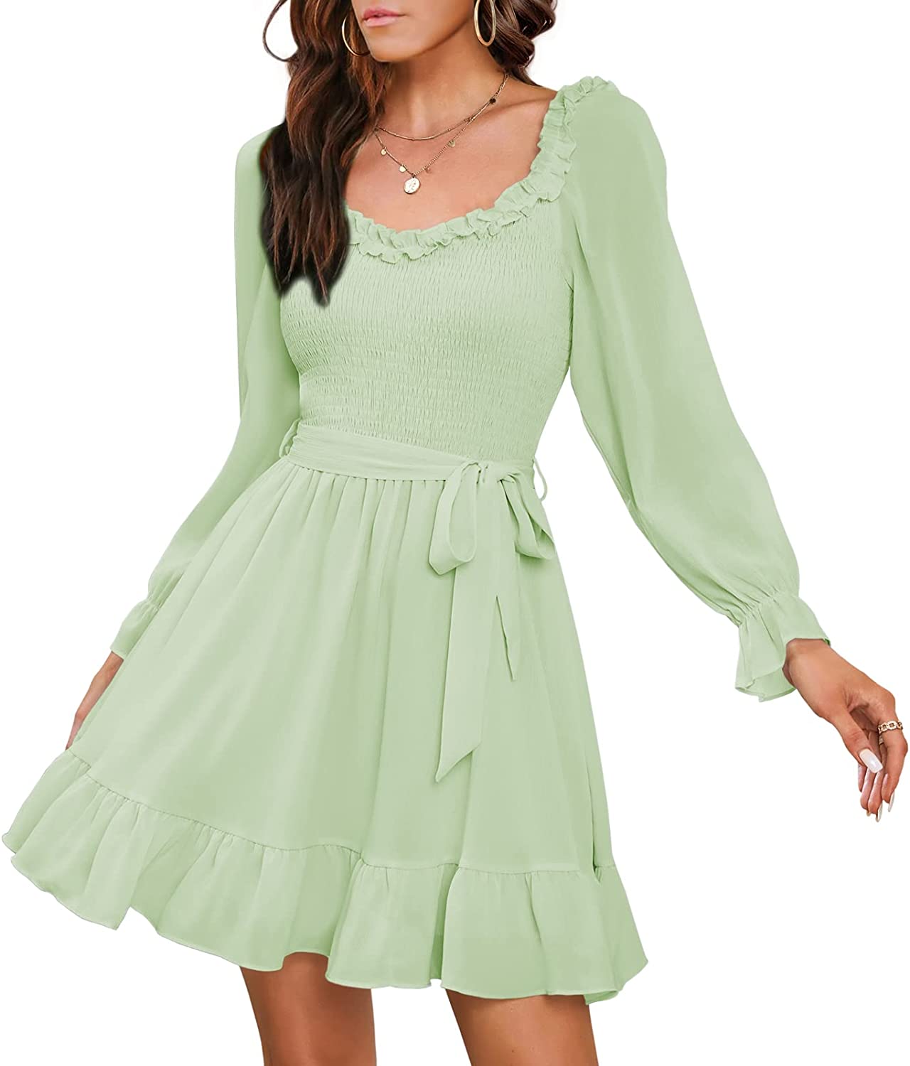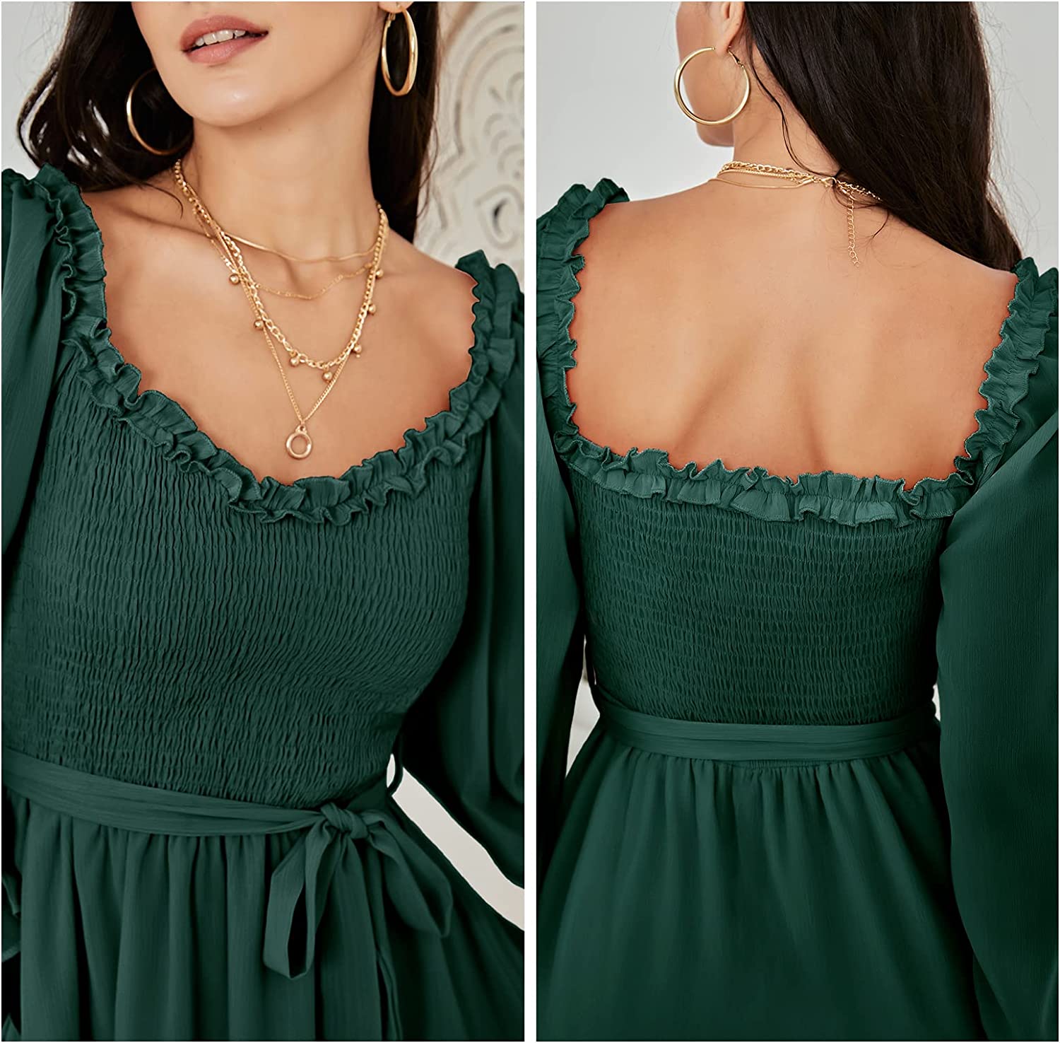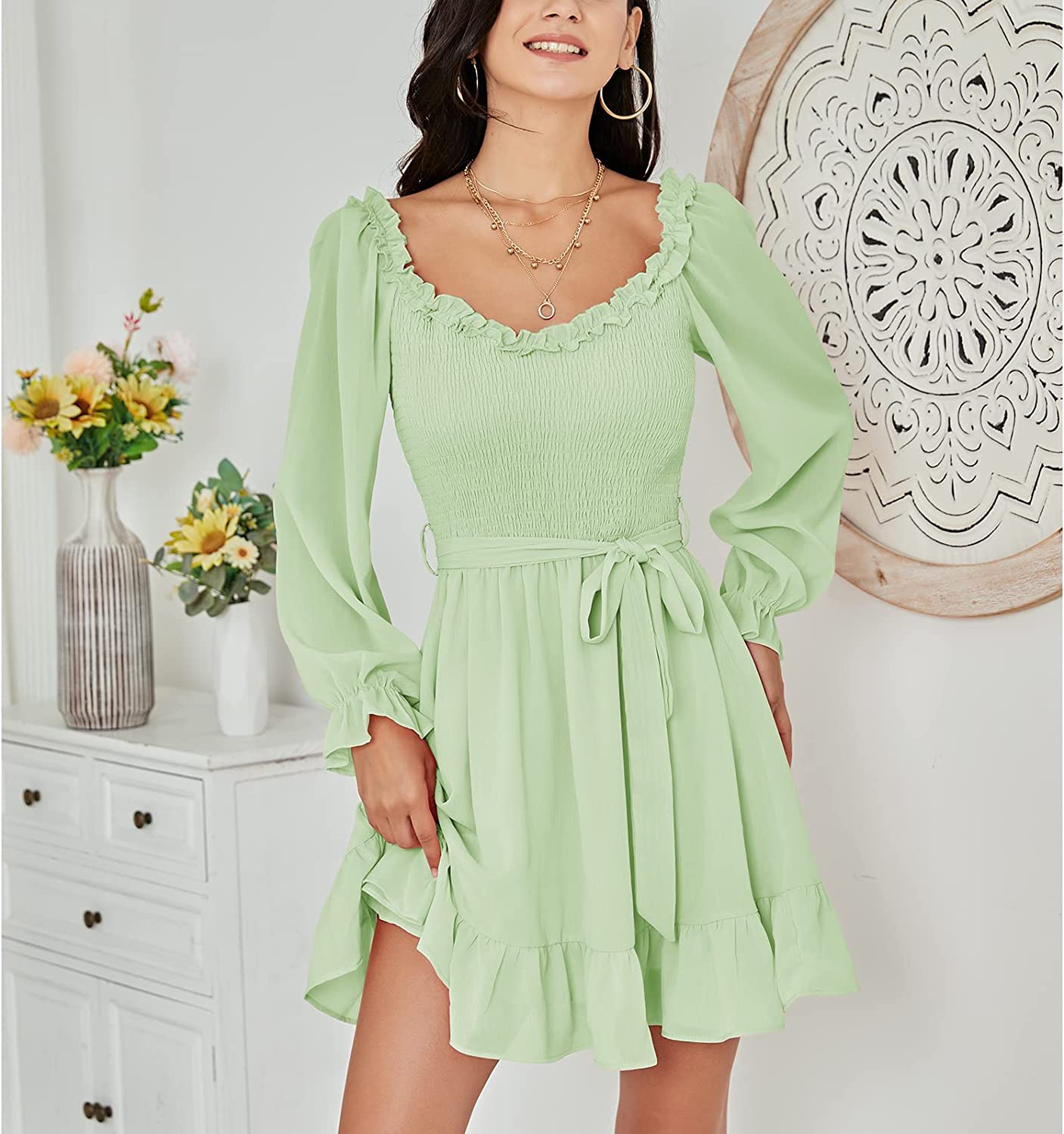 Feature: long sleeve, ruffle V-neck, off-the-shoulder, smocked bodice, mini dress, waist tie, flowy swing skirt, hight wasit,ruffle hem, prefect for teens wear,go toanywhere like cocktail, party, date night in spring.