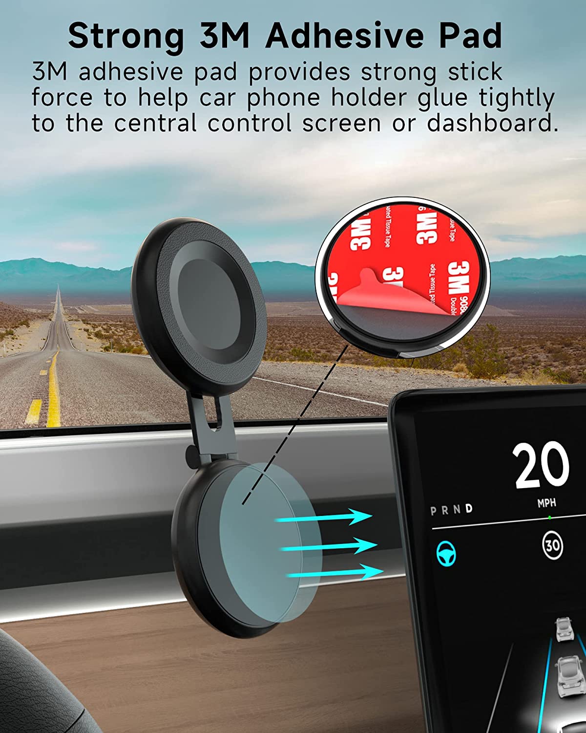 ?【Upgrade Car Phone Mount】 Tesla phone mount With 24 built-in strong magnets, help this cell phone holder holds your phone firmly and stably even on bumpy roads. The base has 2PCS 3M adhesive pads to allow this phone holder to mount on the dashboard or back of the central control screen firmly without worrying about falling out. (NOTE: If your iPhone 12/13/14 has a thick case or you use other iPhone or Android phones, please stick the metal ring on the back of your phone or case.)