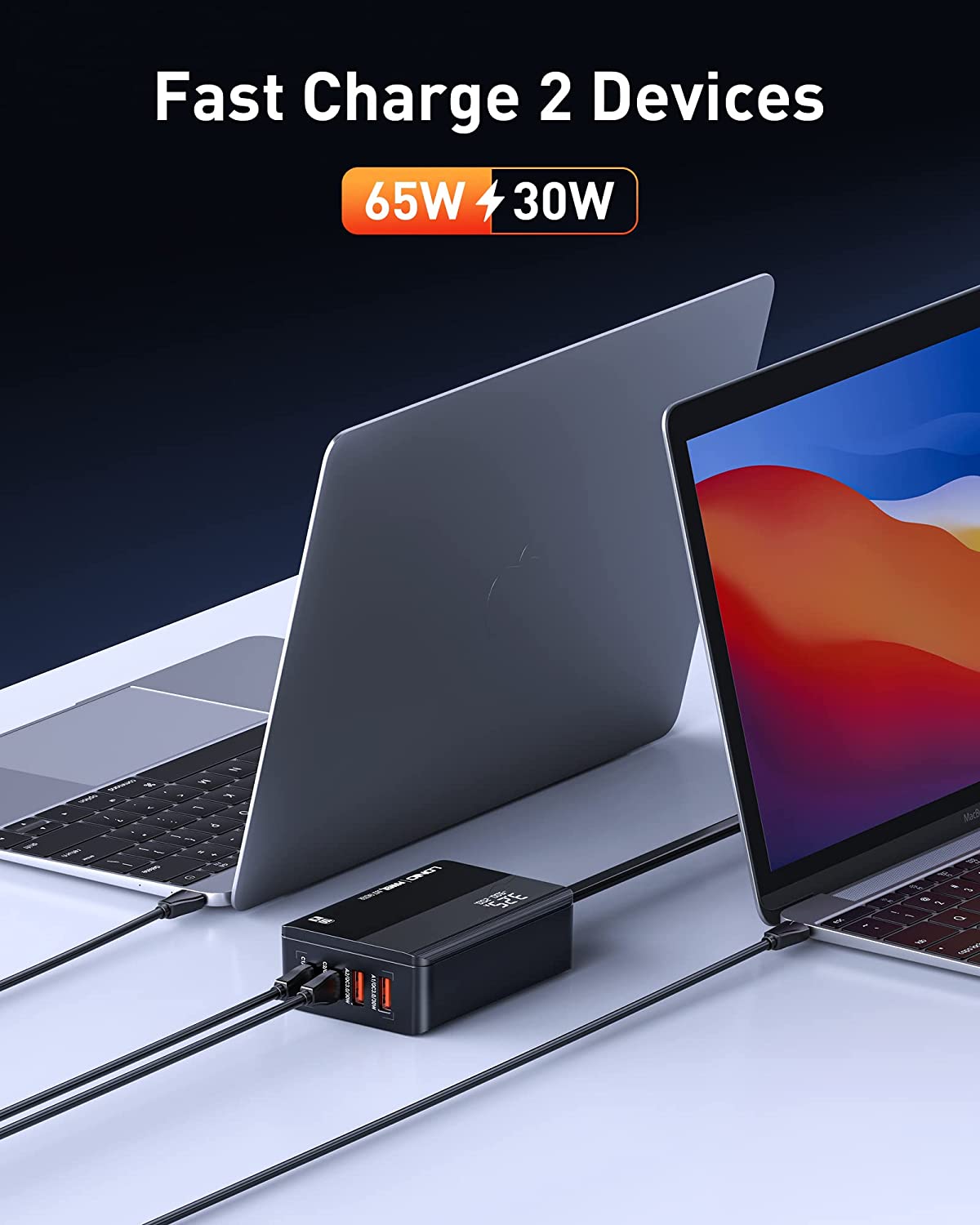 • 【4-in-1 USBC Charger】 100W USB C charger can charge 4 devices at the same time with intelligent BPS power distribution, USB-C1+C2+A1+A2 total of 45W+12W+12W+12W (77W MAX), C1+A1+A2 total of 65W + 12W+22.5W(99.5W Max). Each port is a fast charging port, when only 2 devices are connected at the same time, C1+C2-65W+30W(95W MAX), A1+A2-30W+30W(60W MAX), C2+A1-65W+30W(95WMax), C1+A1-65W+12W(77W MAX).