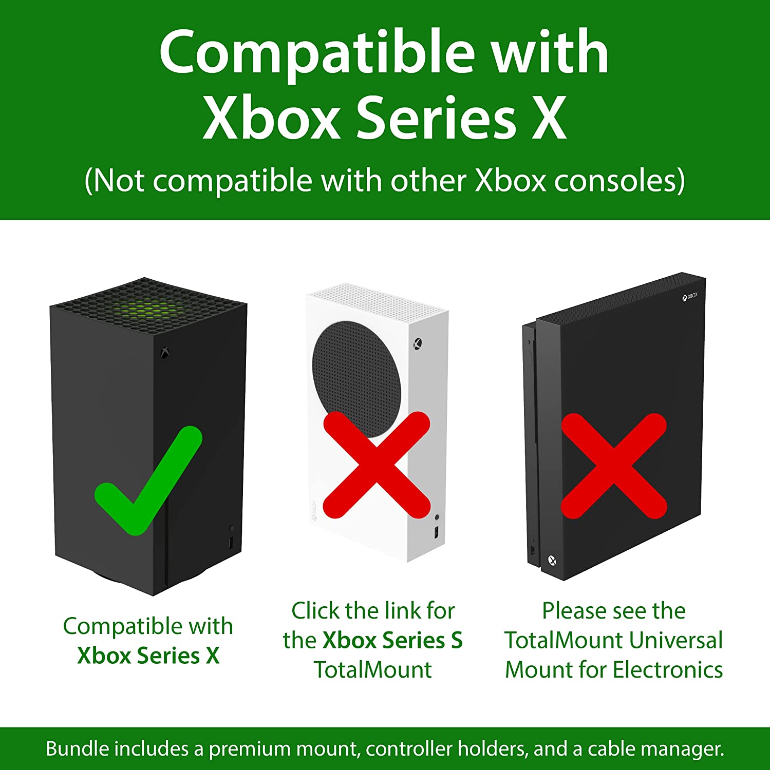• COMPATIBLE WITH XBOX SERIES X. Includes one premium wall mount for Xbox Series X, three controller holders, a cable manager, and all mounting hardware. (Xbox and controllers are not included.) This product was designed in the USA.