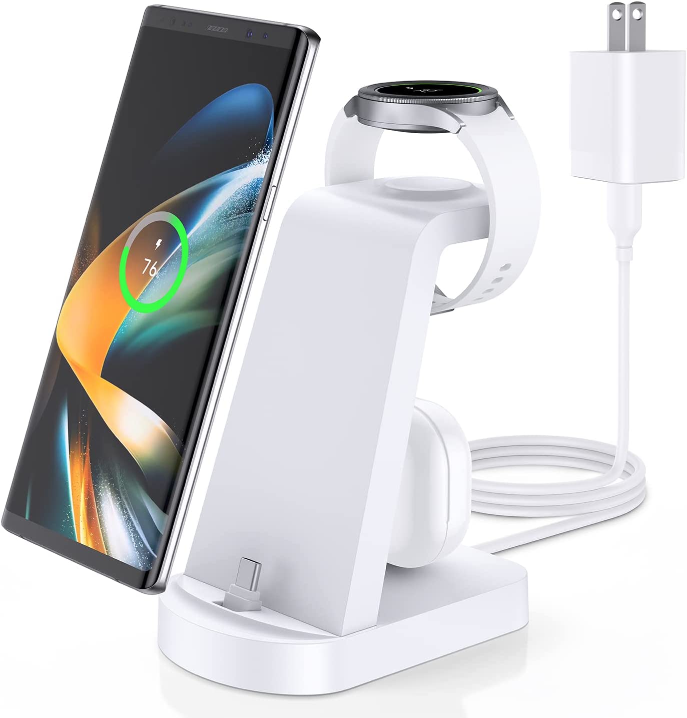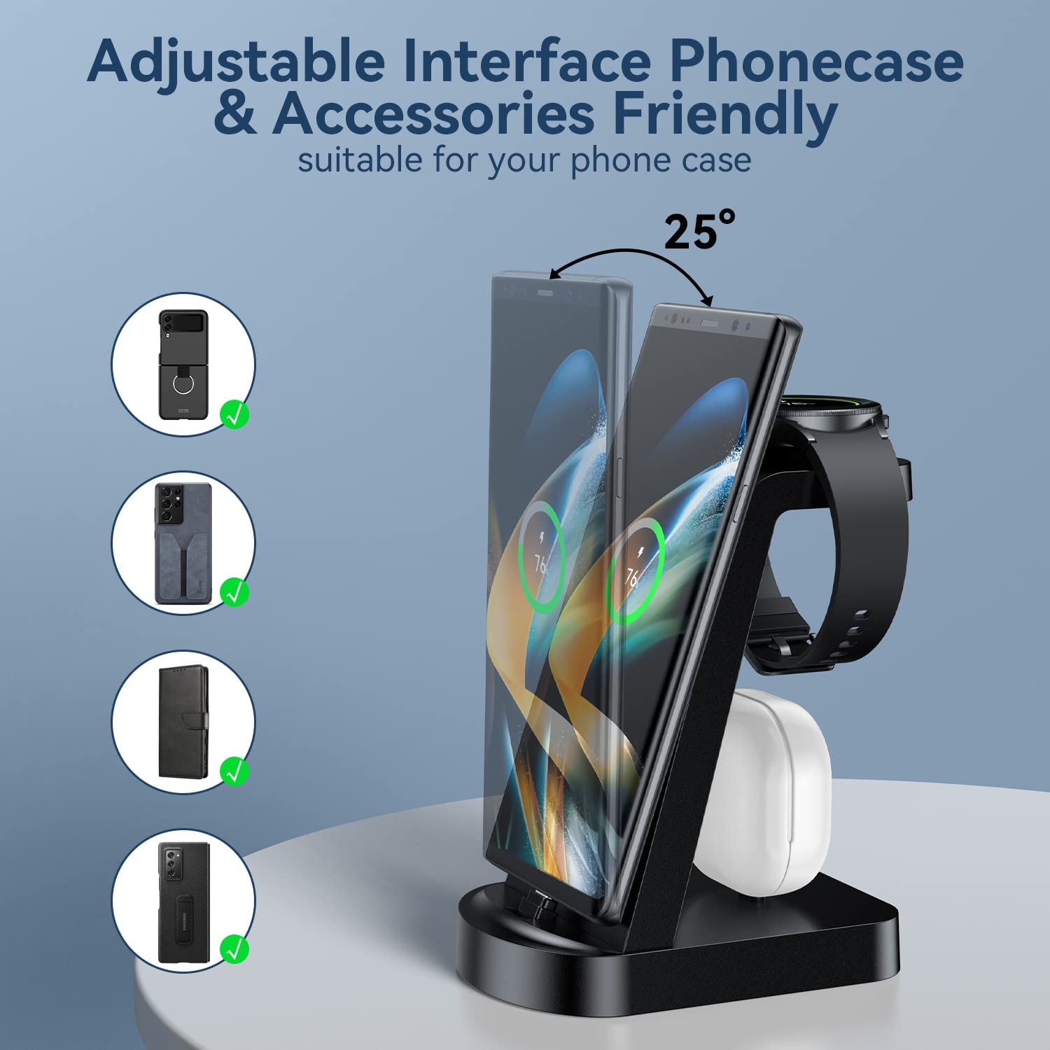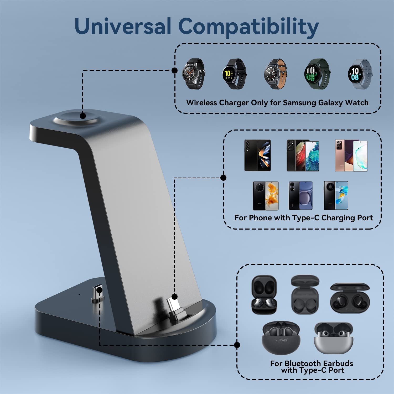 【Better Compatibility】This DUMTERR multifunctional charging station can adapt to more mobilephone models than general wireless chargers. Not only for Samsung Galaxy S22/21/20, but also for most Android phones. This charging station has a built-in TYPE C charger interface, which can charge any Android phone and Bluetooth headphone with Type-C charging port.The Wireless charging dock of charging station is only for Samsung Galaxy Watch.