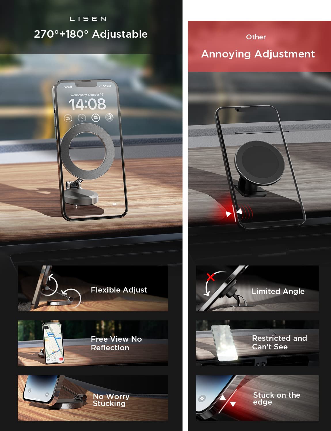 ?MORE STABLE, MORE DURABLE?: LISEN has upgraded this magsafe car dash mount from 3 directions; ①Upgrade Multi-adjustment to help you find the best car mount location; ②Cell phone holder for car mount with most durable all zinc alloy design; ③Magnetic phone car mount that has the strongest magnet force, which can hold up to 12 iPhone 14 Pro Max. LISEN provides at least 1 years of user service.