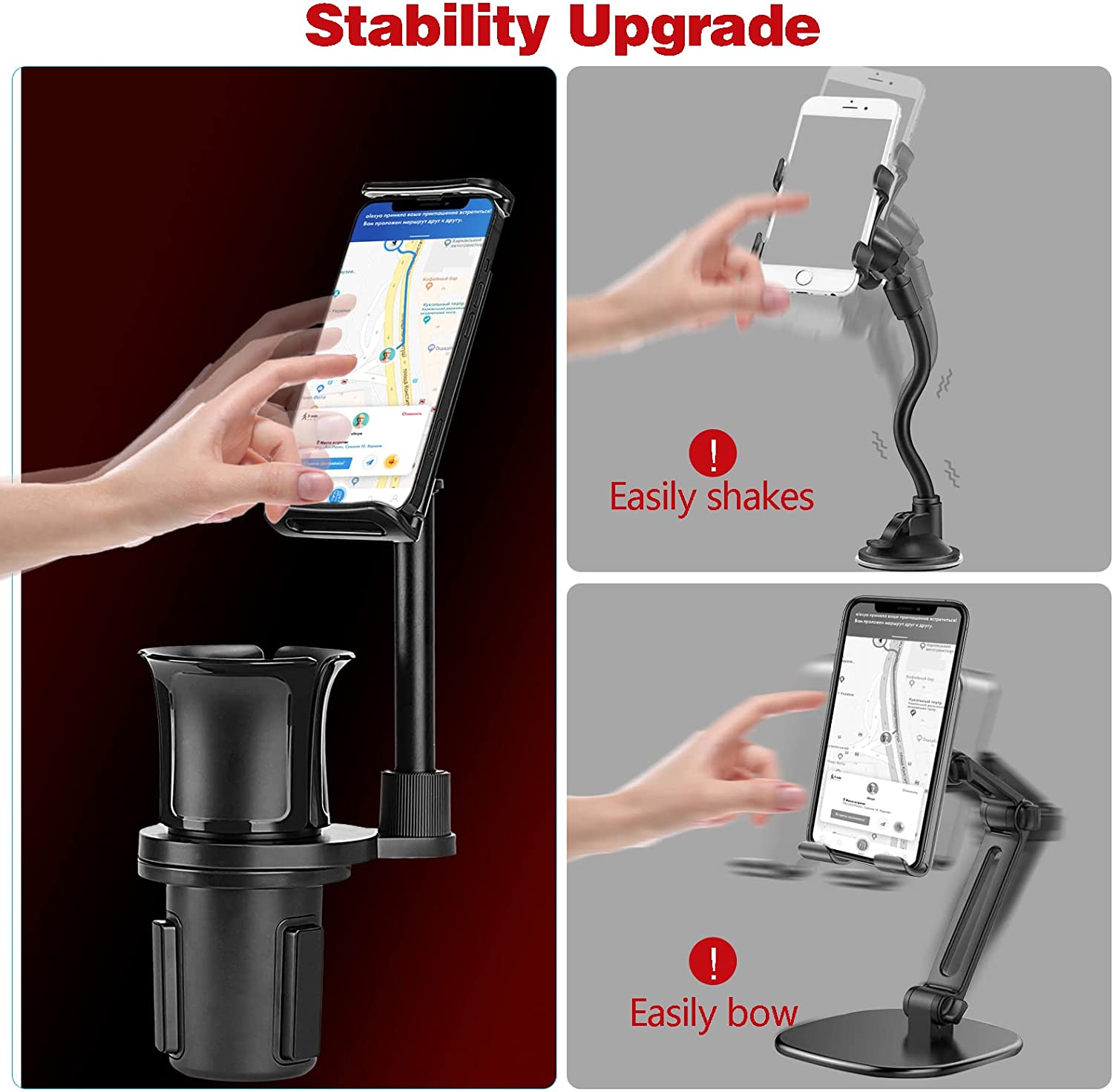 【360°Rotating & Adjustable】The cup holder phone holder mount uses a one-piece aluminum alloy rod that is rock solid. Compared with the gooseneck cup phone mount for cars and the crank arm cup holder car mount, the sturdy straight rod will not shake or bow on bumpy roads. The car phone mount head can be rotated at 360° and can be adjusted to suit your position. Inserting the cup holder just rotate the vane clockwise to expand the size of the bottom adapter and firmly fix the base.