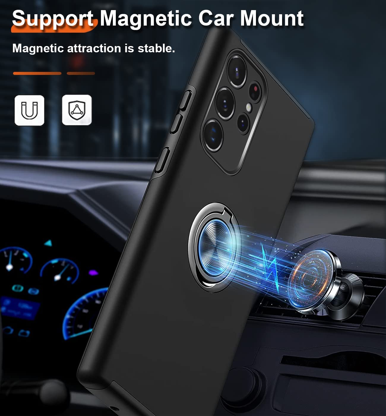 - [2023 Upgraded Kickstand]: Humanized design, 360°horizontal + 120°vertical rotation buit-in stand can lay flat on the back instead of having a large bulge where the ring and magnet are as some cases tend to do. Perfect for hands-free movie viewing. Metal ring kickstand also works greatly with magnetic car mount.
