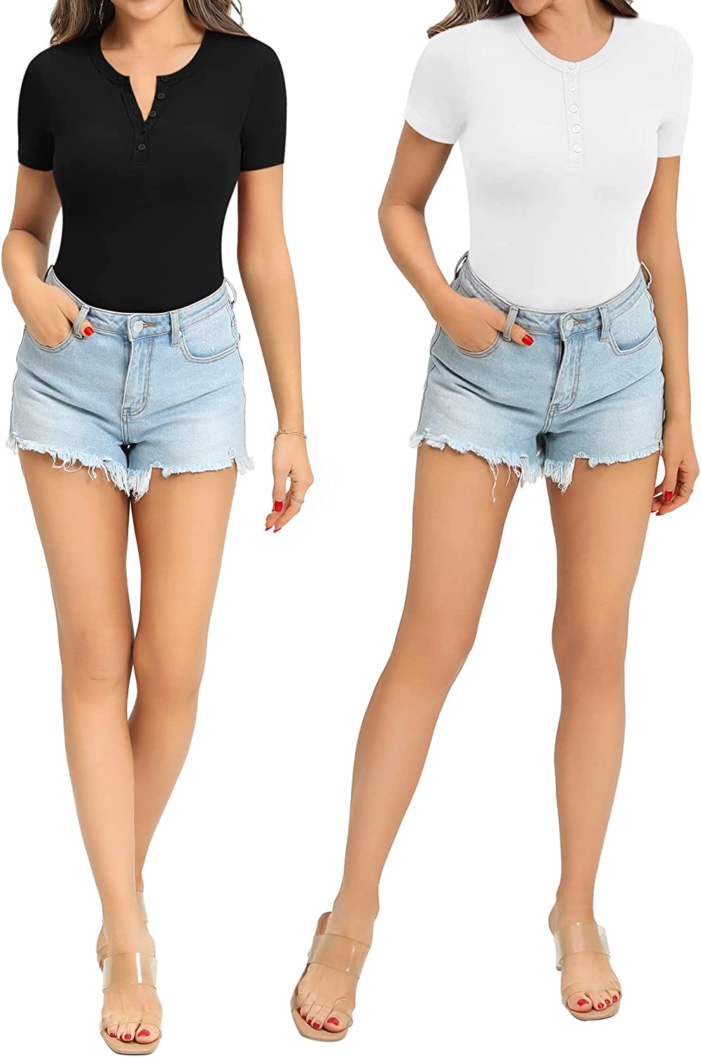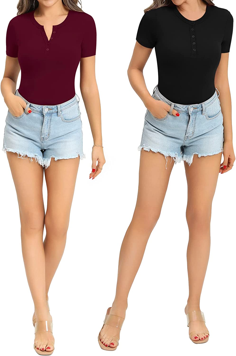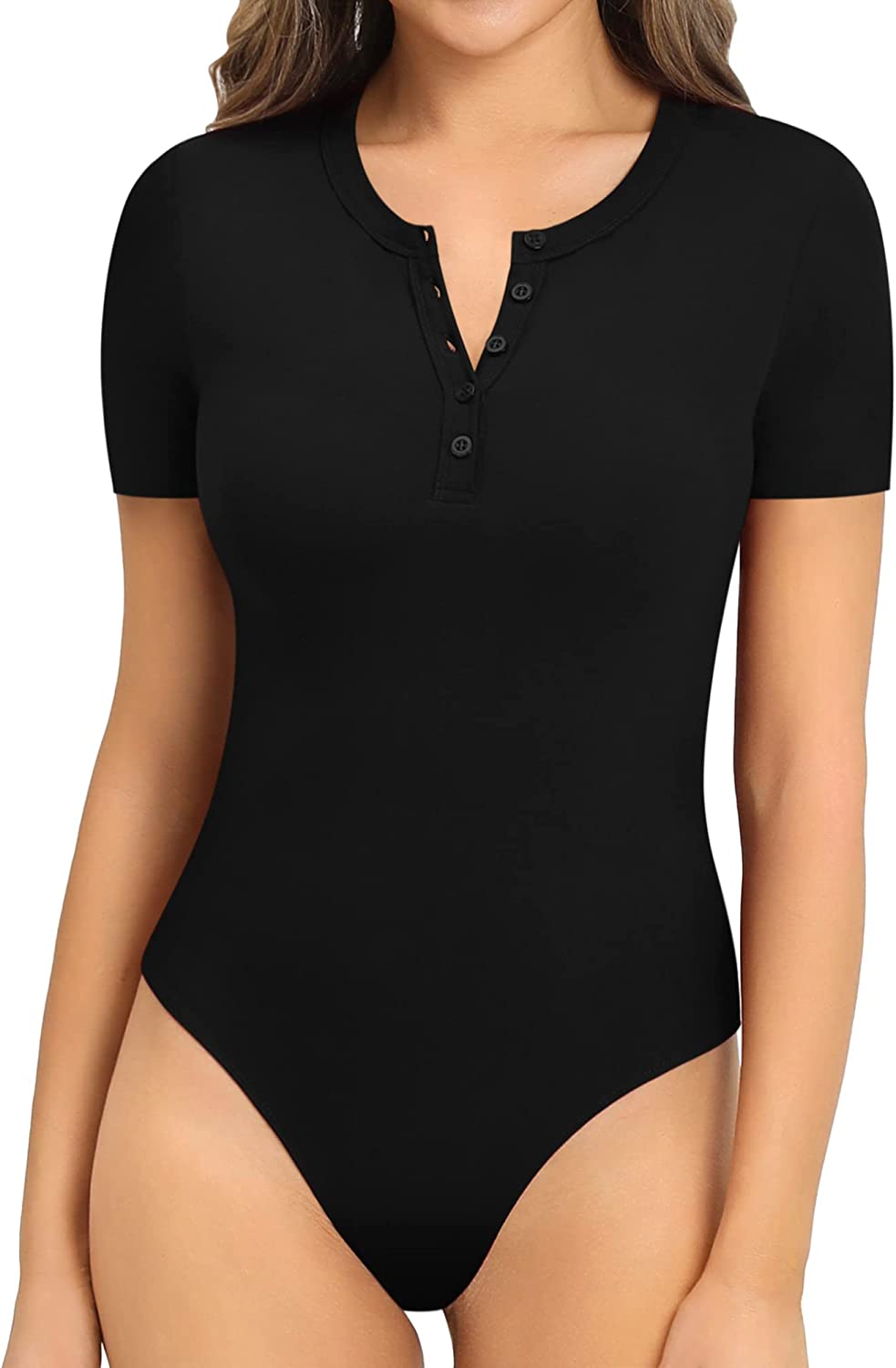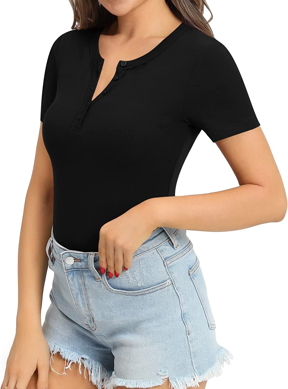MANGOPOP Women's Round Neck Button Down Short Sleeve Long Sleeve Bodysuit Slim Fit Tops